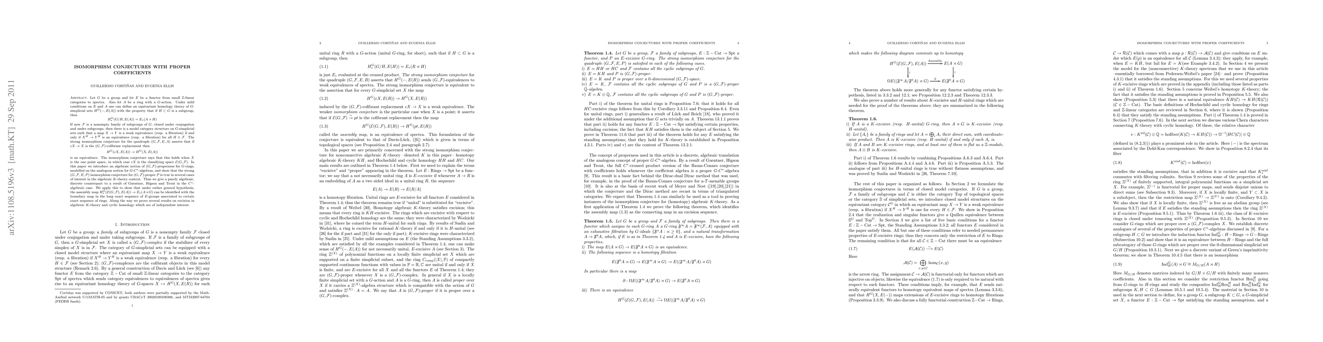 Let $G$ be a group and let $E$ be a functor from small $\Z$-linear categories to spectra. Also let $A$ be a ring with a $G$-action. Under mild conditions on $E$ and $A$ one can define an equivariant homology theory of $G$-simplicial sets $H^G(-,E(A))$ with the property that if $H\subset G$ is a subgroup, then \[ H^G_*(G/H,E(A))=E_*(A\rtimes H) \] If now $\cF$ is a nonempty family of subgroups of $G$, closed under conjugation and under subgroups, then there is a model category structure on $G$-simplicial sets such that a map $X\to Y$ is a weak equivalence (resp. a fibration) if and only if $X^H\to Y^H$ is an equivalence (resp. a fibration) for all $H\in\cF$. The strong isomorphism conjecture for the quadruple $(G,\cF,E,A)$ asserts that if $cX\to X$ is the $(G,\cF)$-cofibrant replacement then \[ H^G(cX,E(A))\to H^G(X,E(A)) \] is an equivalence. The isomorphism conjecture says that this holds when $X$ is the one point space, in which case $cX$ is the classifying space $\cE(G,\cF)$. In this paper we introduce an algebraic notion of $(G,\cF)$-properness for $G$-rings, modelled on the analogous notion for $G$-$C^*$-algebras, and show that the strong $(G,\cF,E,P)$ isomorphism conjecture for $(G,\cF)$-proper $P$ is true in several cases of interest in the algebraic $K$-theory context. Thus we give a purely algebraic, discrete counterpart to a result of Guentner, Higson and Trout in the $C^*$-algebraic case. We apply this to show that under rather general hypothesis, the assembly map $H_*^G(\cE(G,\cF),E(A))\to E_*(A\rtimes G)$ can be identified with the boundary map in the long exact sequence of $E$-groups associated to certain exact sequence of rings. Along the way we prove several results on excision in algebraic $K$-theory and cyclic homology which are of independent interest.