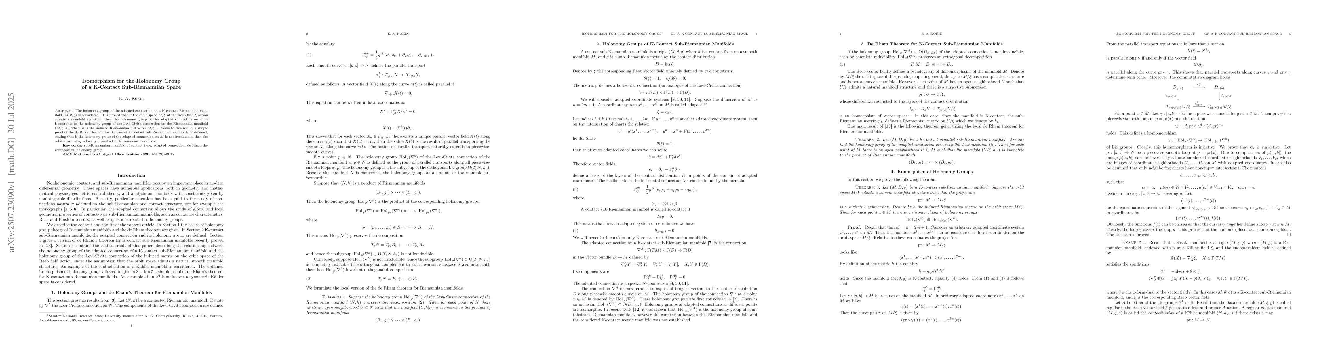 The holonomy group of the adapted connection on a K-contact Riemannian manifold $(M, \theta, g)$ is considered. It is proved that if the orbit space $M/\xi$ of the Reeb field $\xi$ action admits a manifold structure, then the holonomy group of the adapted connection on $M$ is isomorphic to the holonomy group of the Levi-Civita connection on the Riemannian manifold $(M/\xi, h)$, where $h$ is the induced Riemannian metric on $M/\xi$. Thanks to this result, a simple proof of the de Rham theorem for the case of K-contact sub-Riemannian manifolds is obtained, stating that if the holonomy group of the adapted connection on $M$ is not irreducible, then the orbit space $M/\xi$ is locally a product of Riemannian manifolds.