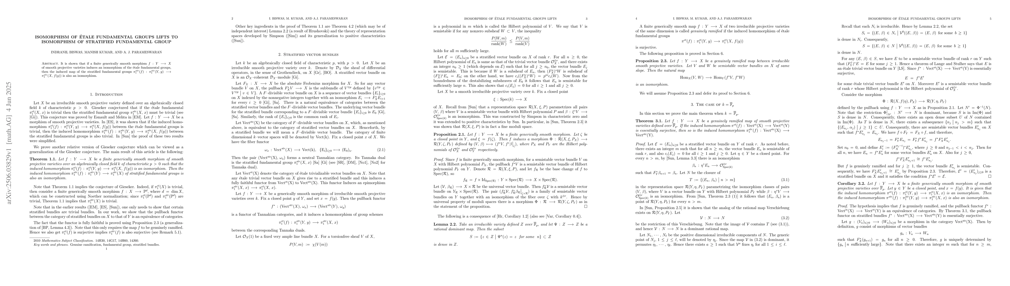 The main theoretical contribution is proving that an isomorphism of 'etale fundamental groups induced by a finite generically smooth morphism between smooth projective varieties lifts to an isomorphism of stratified fundamental groups