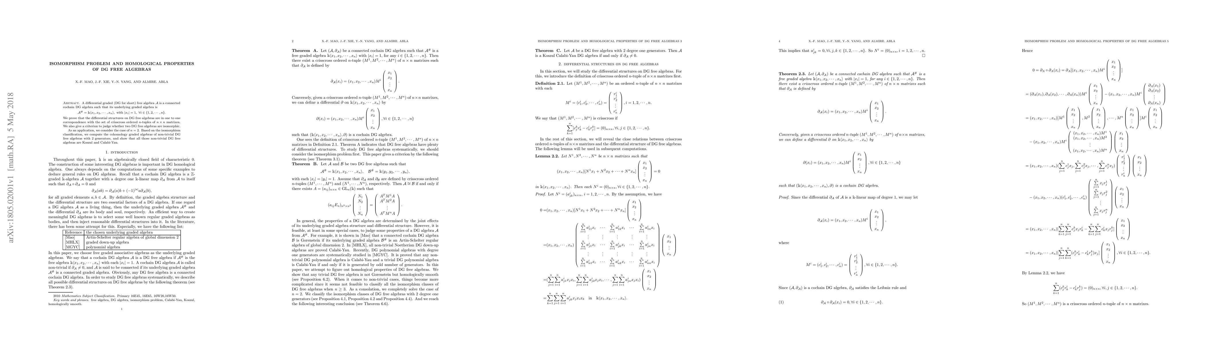 This paper investigates the isomorphism problem and homological properties of DG free algebras, proving that their differential structures correspond to crisscross ordered matrix tuples. It provides an isomorphism criterion for DG free algebras and demonstrates that all non-trivial DG free algebras with two generators are Koszul and Calabi-Yau.