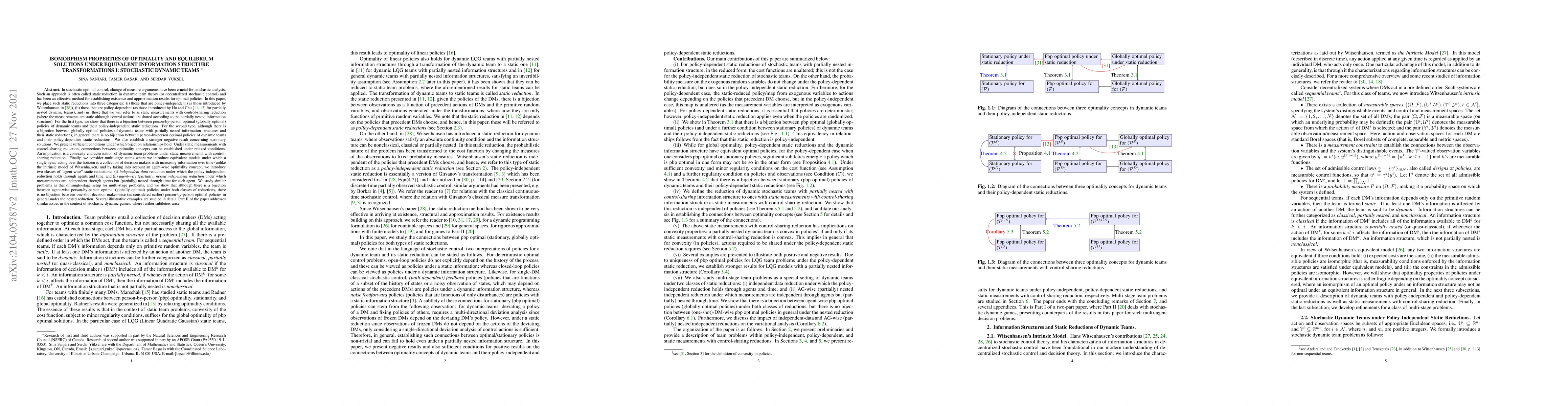 In stochastic optimal control, change of measure arguments have been crucial for stochastic analysis. Such an approach is often called static reduction in dynamic team theory (or decentralized stochastic control) and has been an effective method for establishing existence and approximation results for optimal policies. In this paper, we place such static reductions into three categories: (i) those that are policy-independent (as those introduced by Witsenhausen), (ii) those that are policy-dependent (as those introduced by Ho and Chu for partially nested dynamic teams), and (iii) those that we will refer to as static measurements with control-sharing reduction (where the measurements are static although control actions are shared according to the partially nested information structure). For the first type, we show that there is a bijection between person-by-person optimal (globally optimal) policies of dynamic teams and their policy-independent static reductions. For the second type, although there is a bijection between globally optimal policies of dynamic teams with partially nested information structures and their static reductions, in general there is no bijection between person-by-person optimal policies of dynamic teams and their policy-dependent static reductions. We also establish a stronger negative result concerning stationary solutions. We present sufficient conditions under which bijection relationships hold. Under static measurements with control-sharing reduction, connections between optimality concepts can be established under relaxed conditions. An implication is a convexity characterization of dynamic team problems under static measurements with control-sharing reduction. Finally, we introduce multi-stage refinements of such reductions. Part II of the paper addresses similar issues in the context of stochastic dynamic games, where further subtleties arise.