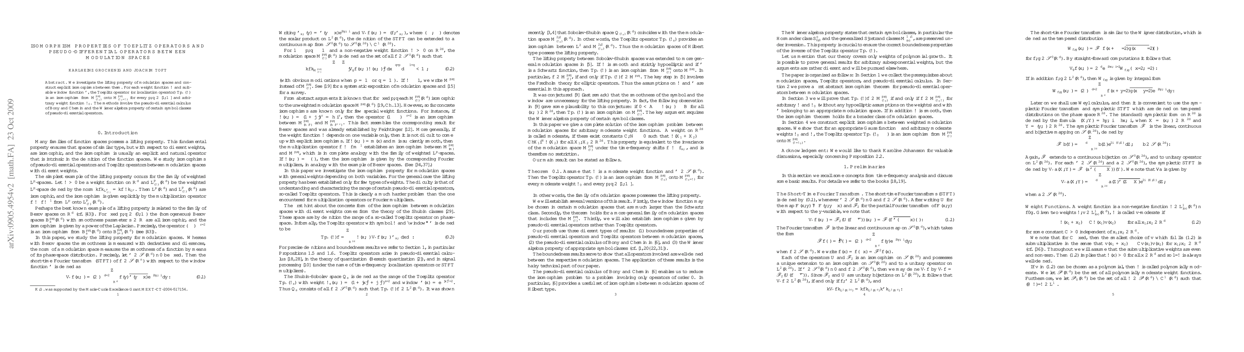This paper investigates isomorphisms between modulation spaces using Toeplitz operators and pseudo-differential operators, showing that they can map certain modulation spaces to others with different weights.