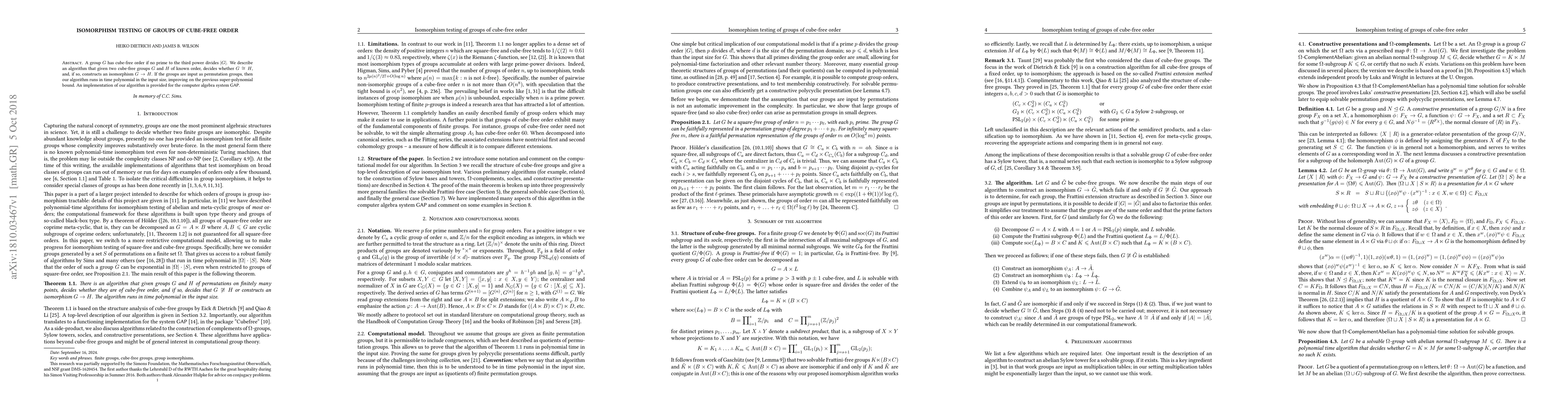 The paper describes an algorithm for testing isomorphism of groups of cube-free order, improving upon previous super-polynomial bounds. The algorithm is implemented for the computer algebra system GAP.