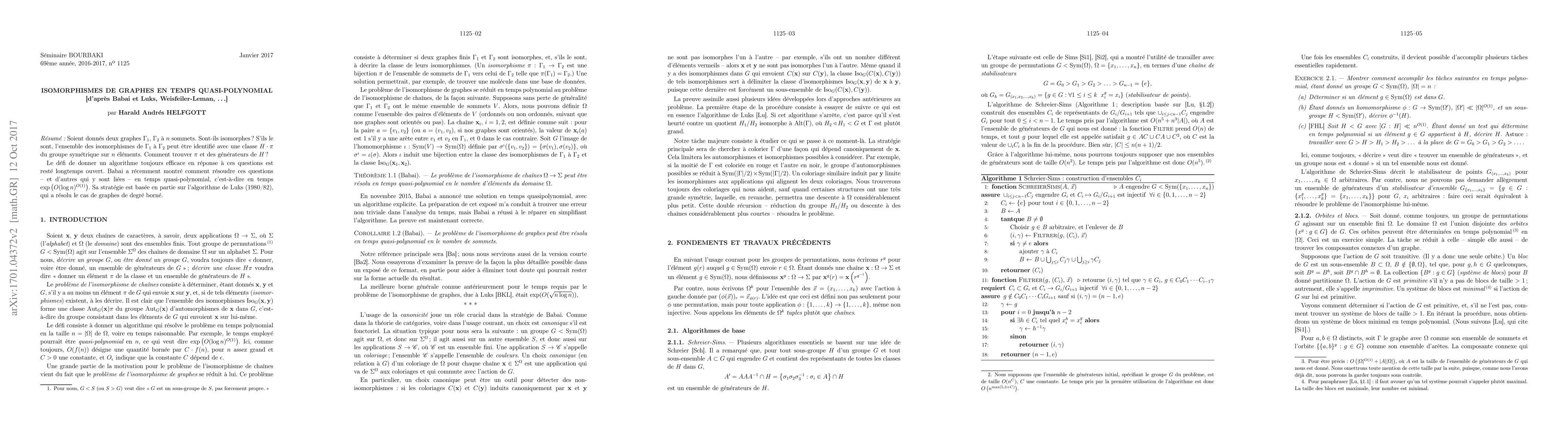 This paper discusses the graph isomorphism problem, presenting a quasipolynomial-time algorithm by Babai to determine if two given graphs are isomorphic and to find their isomorphisms. Babai's approach builds on Luks's earlier algorithm for graphs of bounded degree.