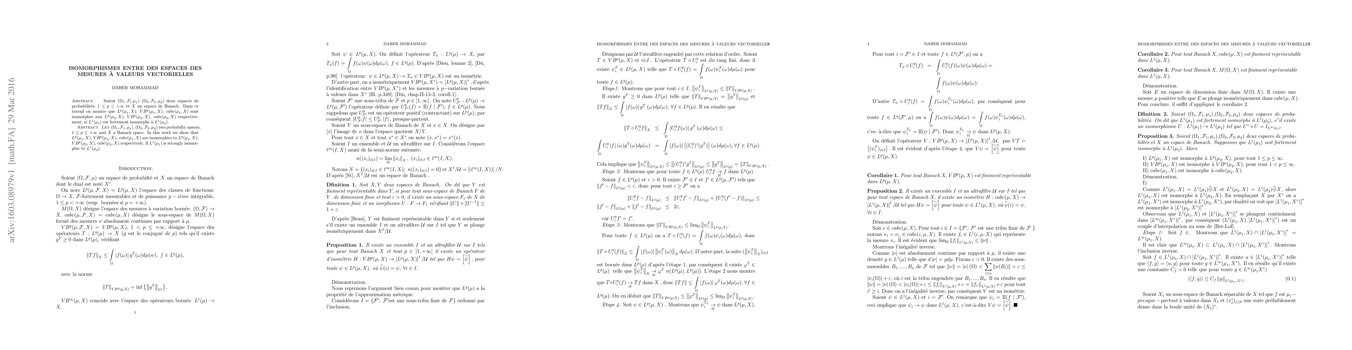 Let $(\Omega_1, \mathcal{F}_1, \mu_1)$, $(\Omega_2, \mathcal{F}_2, \mu_2)$ be two probabilty spaces, $1\leq p\leq +\infty$ and $X$ a Banach space. In this work we show that $L^p(\mu_1, X)$, $VB^p (\mu_1,X),$ $cabv(\mu_{1},X)$ are isomorphic to $L^p(\mu_2, X),$ $VB^p(\mu_2, X)$, $cabc(\mu_2, X)$ respectively, if $L^1(\mu_1)$ is strongly isomorphic to $L^1(\mu_2)$.
