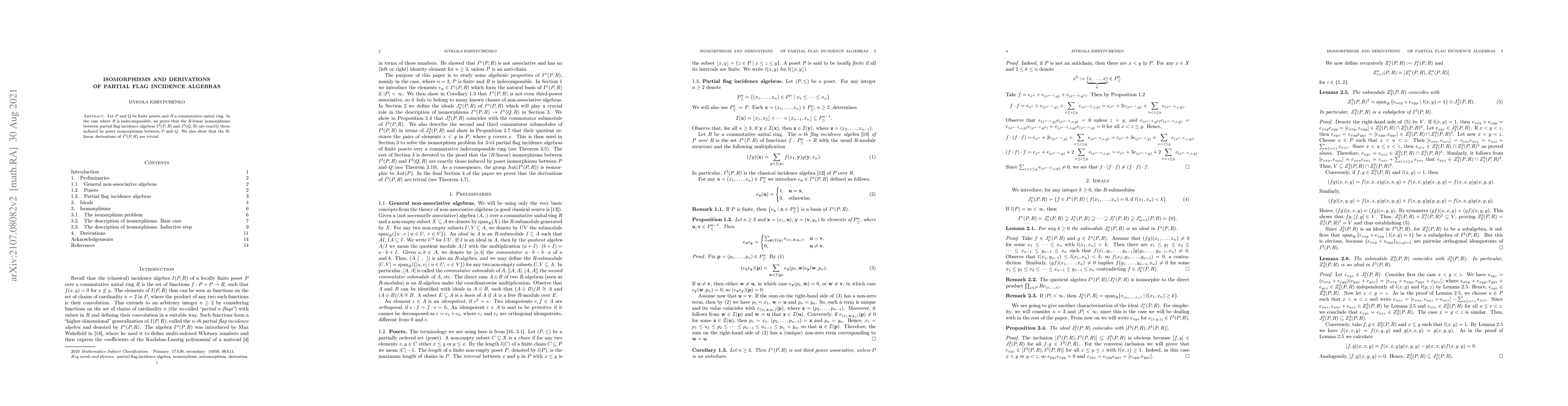 Let $P$ and $Q$ be finite posets and $R$ a commutative unital ring. In the case where $R$ is indecomposable, we prove that the $R$-linear isomorphisms between partial flag incidence algebras $I^3(P,R)$ and $I^3(Q,R)$ are exactly those induced by poset isomorphisms between $P$ and $Q$. We also show that the $R$-linear derivations of $I^3(P,R)$ are trivial.