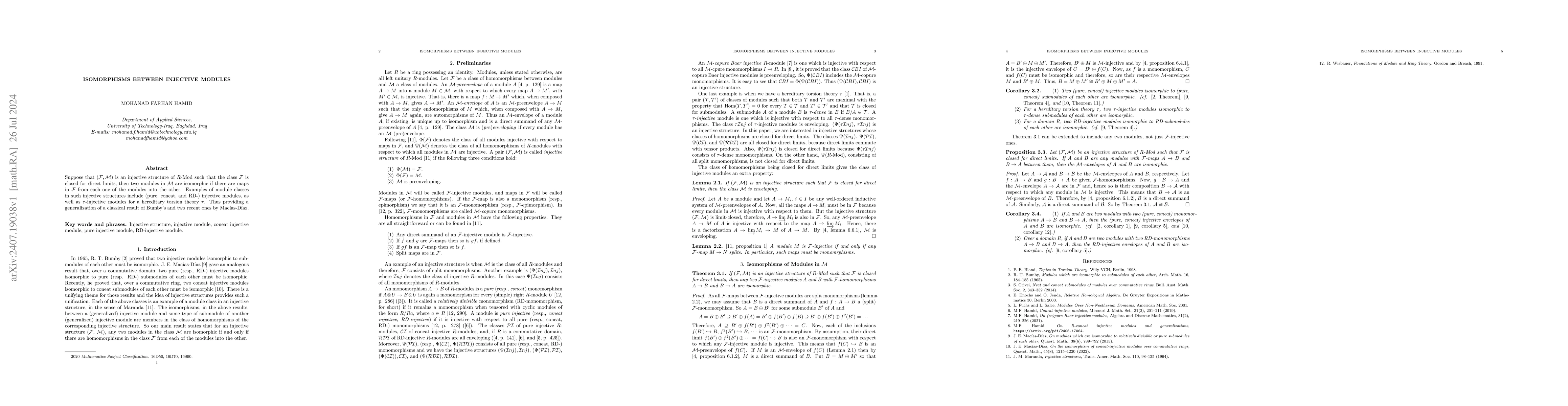 This paper explores isomorphisms between modules within injective structures in $R$-Mod, showing that two modules are isomorphic if there exist maps in $\mathcal{F}$ from each to the other, generalizing classical and recent results by Bumby and Mac\'{i}as-D\'{i}az. Examples include pure, coneat, and RD-injective modules.
