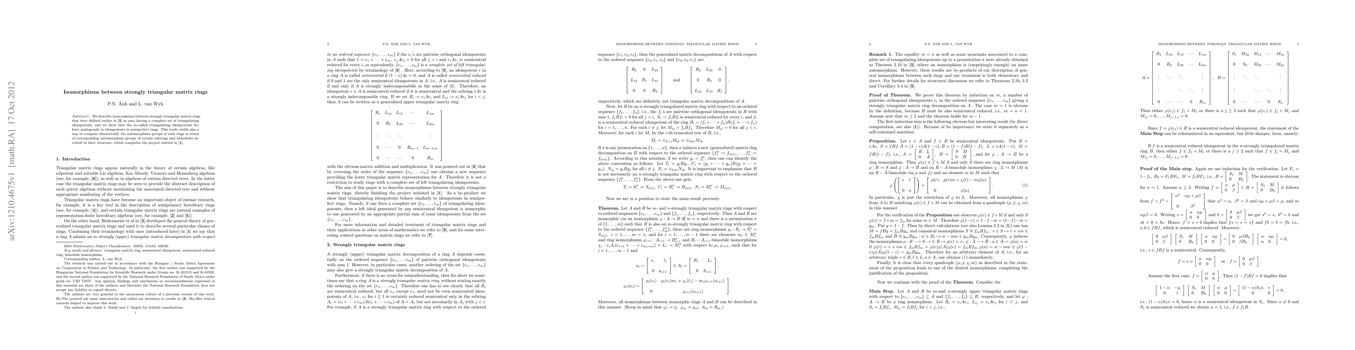This paper explores isomorphisms between strongly triangular matrix rings, demonstrating their behavior analogous to idempotents in semiperfect rings and providing a method to compute their automorphism groups based on subrings and bimodules.