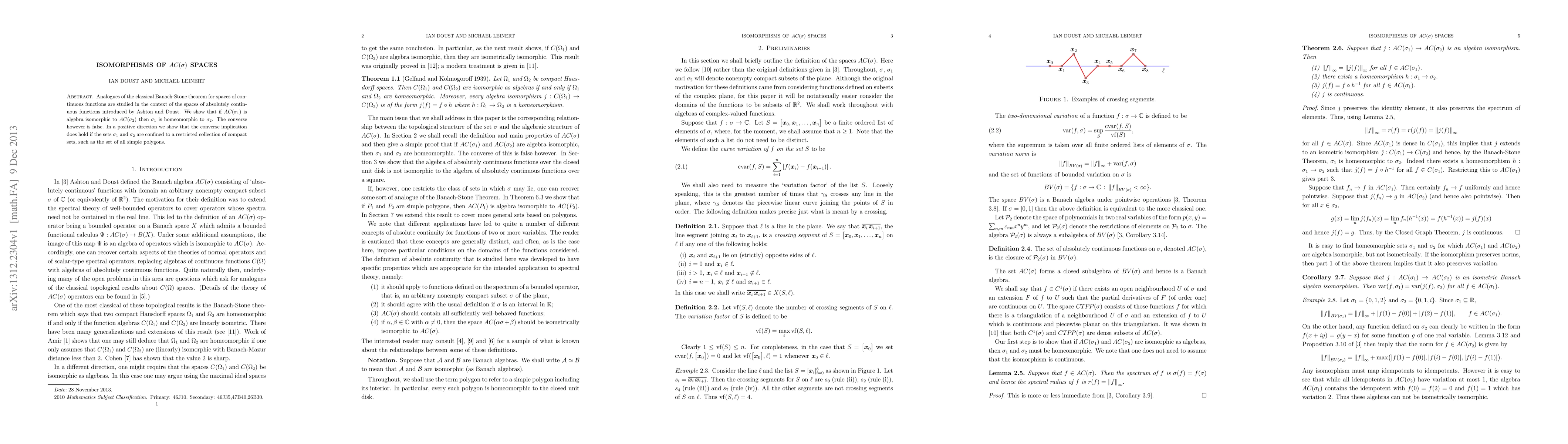 Analogues of the classical Banach-Stone theorem for spaces of continuous functions are studied in the context of the spaces of absolutely continuous functions introduced by Ashton and Doust. We show that if $AC(\sigma_1)$ is algebra isomorphic to $AC(\sigma_2)$ then $\sigma_1$ is homeomorphic to $\sigma_2$. The converse however is false. In a positive direction we show that the converse implication does hold if the sets $\sigma_1$ and $\sigma_2$ are confined to a restricted collection of compact sets, such as the set of all simple polygons.