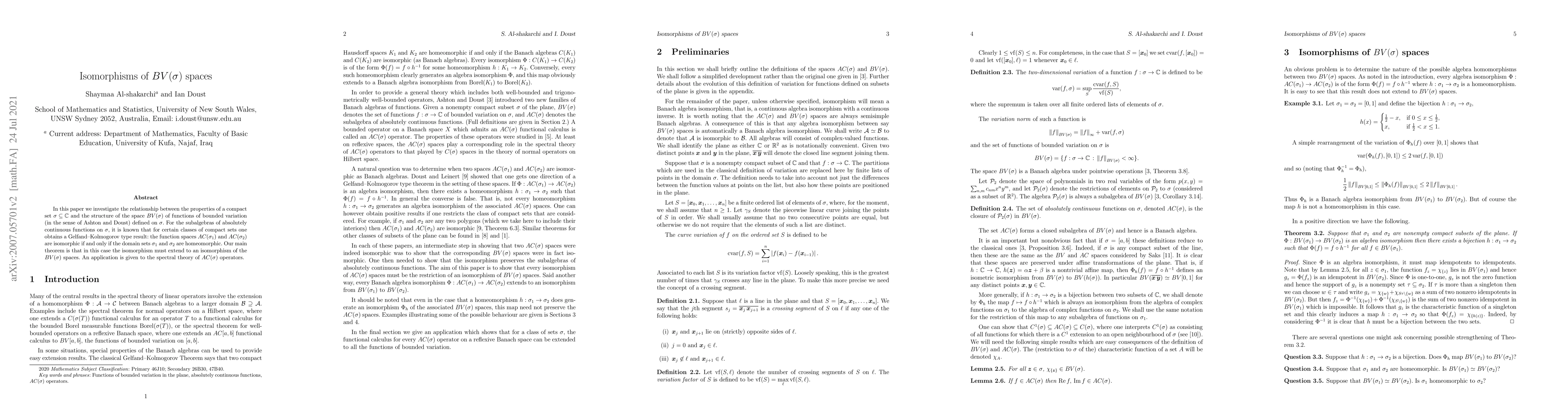 The paper introduces and proves key theorems regarding isomorphisms between BV(ℓ) spaces for specific classes of compact sets ℓ, extending previous results for absolutely continuous functions.