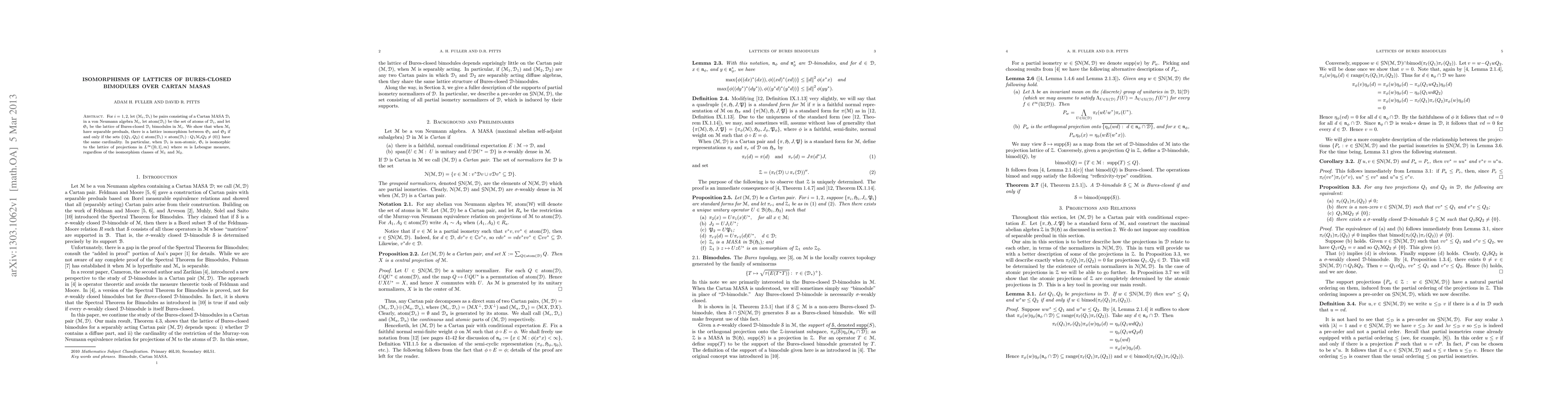 For i=1,2, let (M_i,D_i) be pairs consisting of a Cartan MASA D_i in a von Neumann algebra M_i, let atom(D_i) be the set of atoms of D_i, and let S_i be the lattice of Bures-closed D_i bimodules in M_i. We show that when M_i have separable preduals, there is a lattice isomorphism between S_1 and S_2 if and only if the sets {(Q_1, Q_2) \in atom(D_i) x atom(D_i): Q_1 M_i Q_2 \neq (0)} have the same cardinality. In particular, when D_i is non-atomic, S_i is isomorphic to the lattice of projections in L^\infty([0,1],m) where m is Lebesgue measure, regardless of the isomorphism classes of M_1 and M_2.