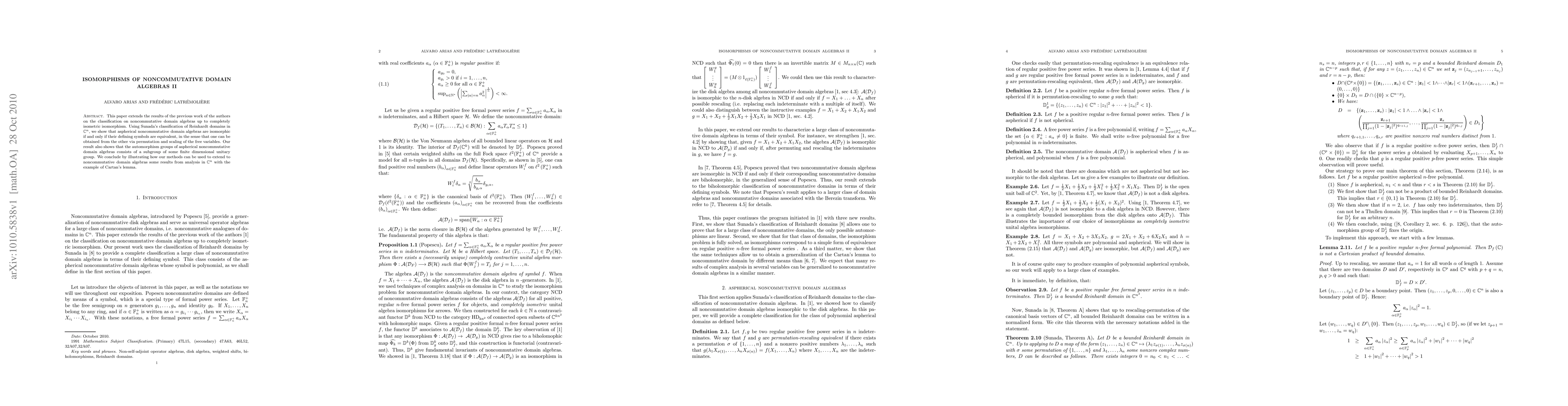 This paper classifies aspherical noncommutative domain algebras up to completely isometric isomorphism, showing they are isomorphic if their defining symbols are equivalent via permutation and scaling of variables. It also reveals that their automorphism groups are subgroups of finite-dimensional unitary groups, and demonstrates the application of these methods to extend results from analysis in $C^n$, exemplified by Cartan's lemma.