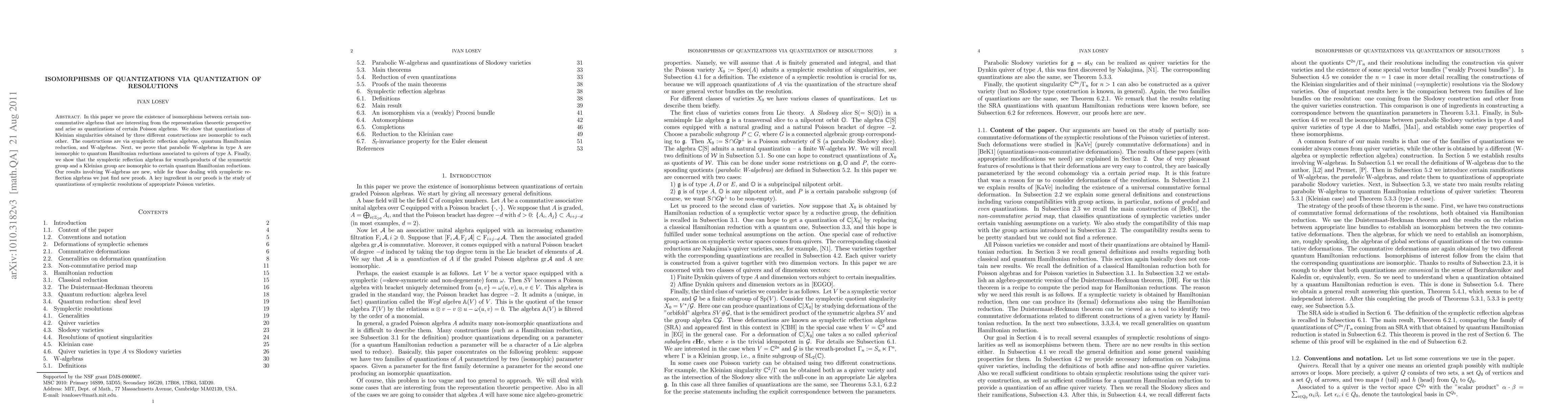 This paper establishes isomorphisms between various non-commutative algebras arising from quantizations of Poisson algebras, showing equivalences among quantizations via different constructions like symplectic reflection algebras, quantum Hamiltonian reduction, and W-algebras. The study reveals new results for W-algebras and provides novel proofs for symplectic reflection algebras, leveraging the quantization of resolutions.