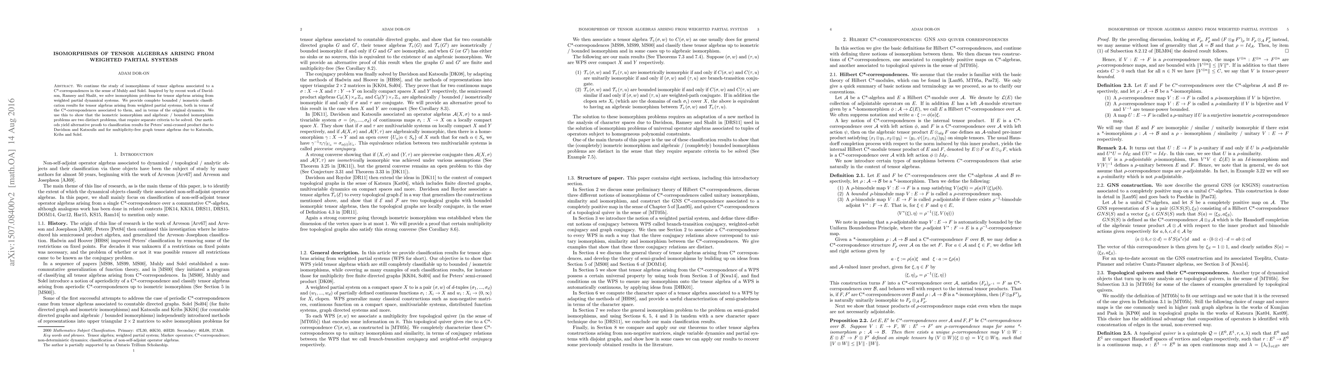 We continue the study of isomorphisms of tensor algebras associated to a C*-correspondences in the sense of Muhly and Solel. Inspired by by recent work of Davidson, Ramsey and Shalit, we solve isomorphism problems for tensor algebras arising from weighted partial dynamical systems. We provide complete bounded / isometric classification results for tensor algebras arising from weighted partial systems, both in terms of the C*-correspondences associated to them, and in terms of the original dynamics. We use this to show that the isometric isomorphism and algebraic / bounded isomorphism problems are two distinct problems, that require separate criteria to be solved. Our methods yield alternative proofs to classification results for Peters' semi-crossed product due to Davidson and Katsoulis and for multiplicity-free graph tensor algebras due to Katsoulis, Kribs and Solel.