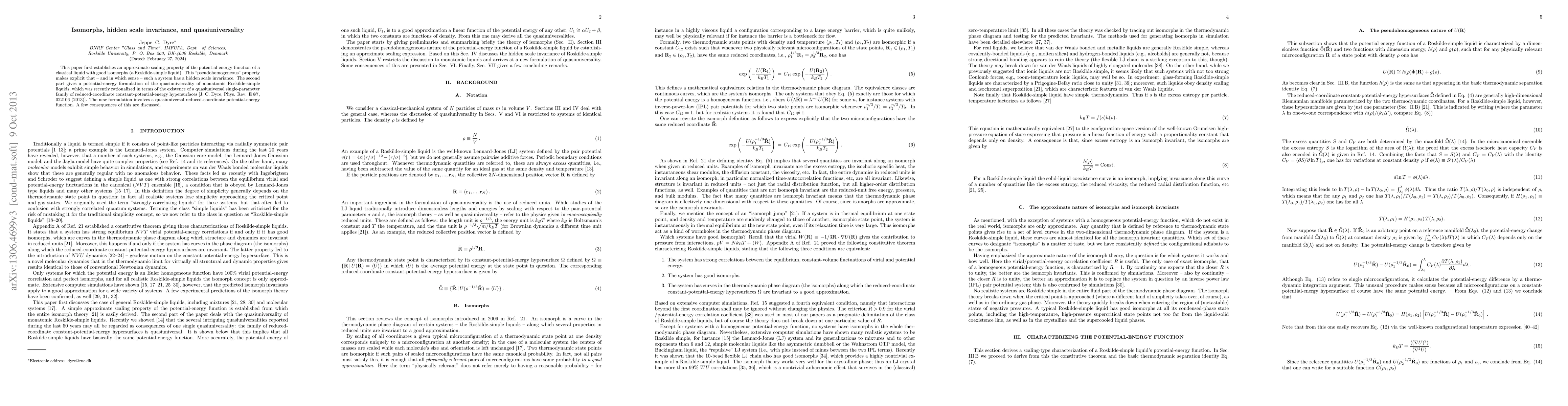 This paper first establishes an approximate scaling property of the potential-energy function of a classical liquid with good isomorphs (a Roskilde-simple liquid). This "pseudohomogeneous" property makes explicit that - and in which sense - such a system has a hidden scale invariance. The second part gives a potential-energy formulation of the quasiuniversality of monatomic Roskilde-simple liquids, which was recently rationalized in terms of the existence of a quasiuniversal single-parameter family of reduced-coordinate constant-potential-energy hypersurfaces [J. C. Dyre, Phys. Rev. E 87, 022106 (2013)]. The new formulation involves a quasiuniversal reduced-coordinate potential-energy function. A few consequences of this are discussed.