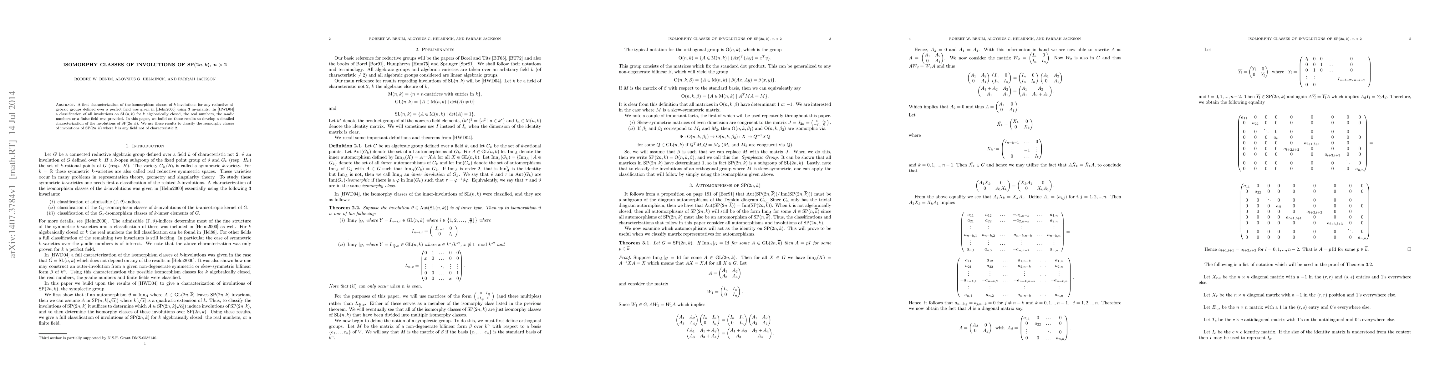 A first characterization of the isomorphism classes of $k$-involutions for any reductive algebraic groups defined over a perfect field was given by Helminck in 2000 using $3$ invariants. In 2004, Helminck, Wu, and Dometrius gave a full classification of all involutions on $\text{SL}(n,k)$ for $k$ algebraically closed, the real numbers, the $p$-adic numbers or a finite field was provided. In this paper, we build on these results to develop a detailed characterization of the involutions of $\text{SP}(2n, k)$. We use these results to classify the isomorphy classes of involutions of $\text{SP}(2n, k)$ where $k$ is any field not of characteristic 2.