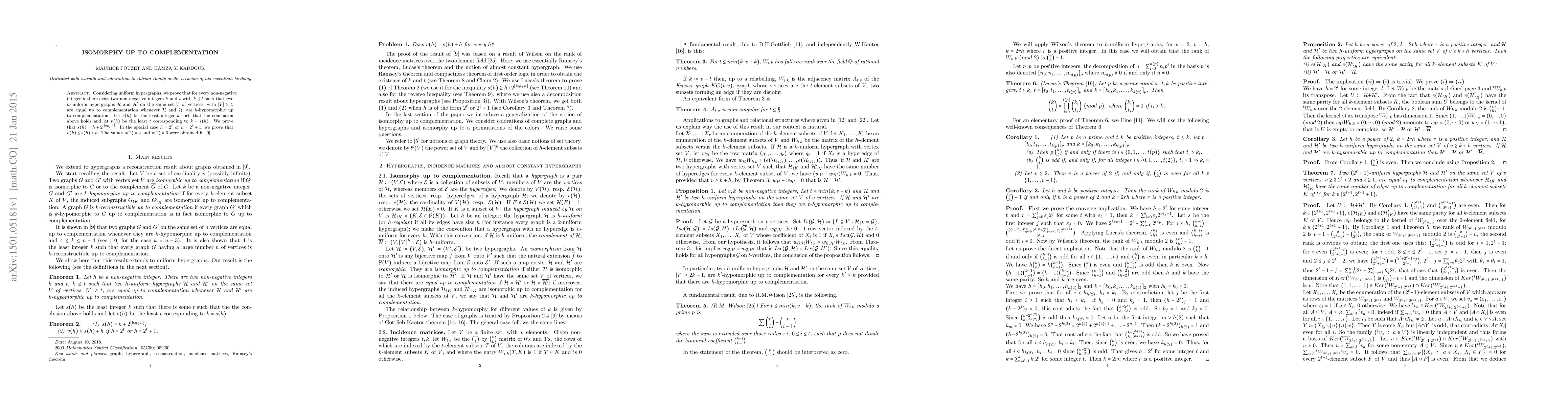 Considering uniform hypergraphs, we prove that for every non-negative integer $h$ there exist two non-negative integers $k$ and $t$ with $k\leq t$ such that two $h$-uniform hypergraphs ${\mathcal H}$ and ${\mathcal H}'$ on the same set $V$ of vertices, with $| V| \geq t$, are equal up to complementation whenever ${\mathcal H}$ and ${\mathcal H}'$ are $k$-{hypomorphic up to complementation}. Let $s(h)$ be the least integer $k$ such that the conclusion above holds and let $v(h)$ be the least $t$ corresponding to $k=s(h)$. We prove that $s(h)= h+2^{\lfloor \log_2 h\rfloor} $. In the special case $h=2^{\ell}$ or $h=2^{\ell}+1$, we prove that $v(h)\leq s(h)+h$. The values $s(2)=4$ and $v(2)=6$ were obtained in a previous work.