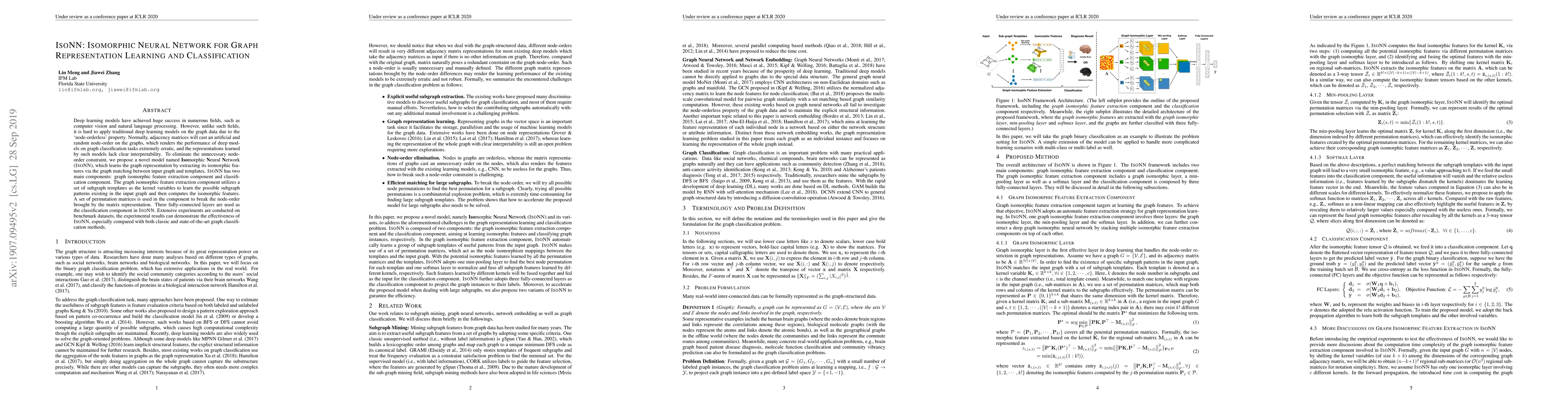 The Isomorphic Neural Network (IsoNN) proposes a novel approach to graph representation learning and classification by extracting isomorphic features through graph matching, eliminating the node-order constraint. IsoNN consists of a graph isomorphic feature extraction component and a classification component, demonstrating superior performance on benchmark datasets compared to existing methods.