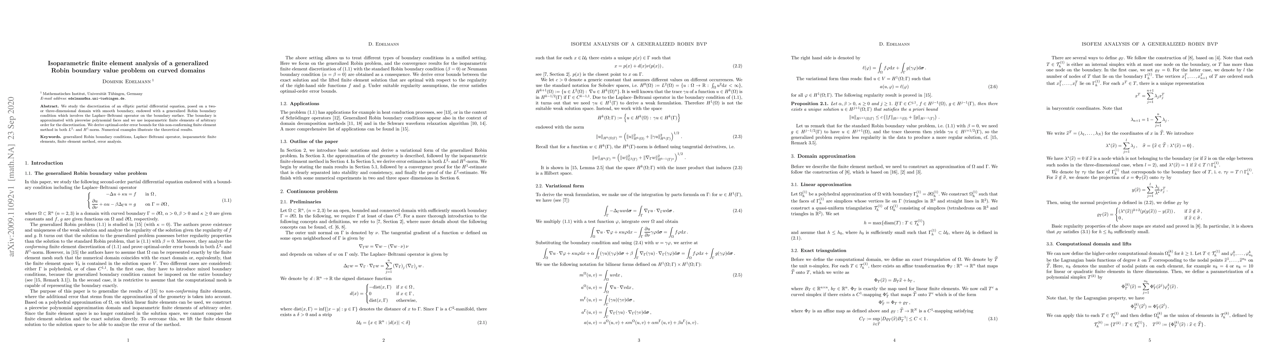 We study the discretization of an elliptic partial differential equation, posed on a two- or three-dimensional domain with smooth boundary, endowed with a generalized Robin boundary condition which involves the Laplace-Beltrami operator on the boundary surface. The boundary is approximated with piecewise polynomial faces and we use isoparametric finite elements of arbitrary order for the discretization. We derive optimal-order error bounds for this non-conforming finite element method in both $L^2$- and $H^1$-norm. Numerical examples illustrate the theoretical results.
