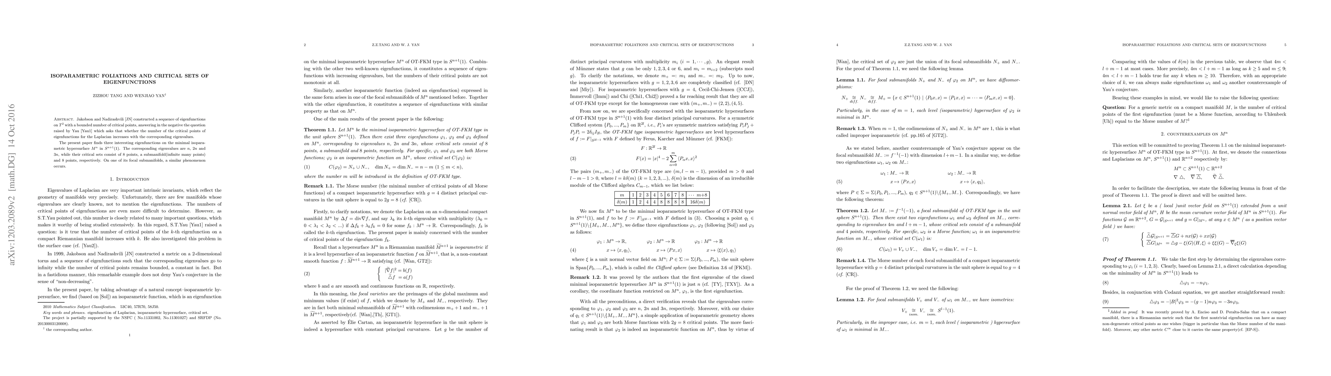 Jakobson and Nadirashvili \cite{JN} constructed a sequence of eigenfunctions on $T^2$ with a bounded number of critical points, answering in the negative the question raised by Yau \cite{Yau1} which asks that whether the number of the critical points of eigenfunctions for the Laplacian increases with the corresponding eigenvalues. The present paper finds three interesting eigenfunctions on the minimal isoparametric hypersurface $M^n$ in $S^{n+1}(1)$. The corresponding eigenvalues are $n$, $2n$ and $3n$, while their critical sets consist of $8$ points, a submanifold(infinite many points) and $8$ points, respectively. On one of its focal submanifolds, a similar phenomenon occurs.