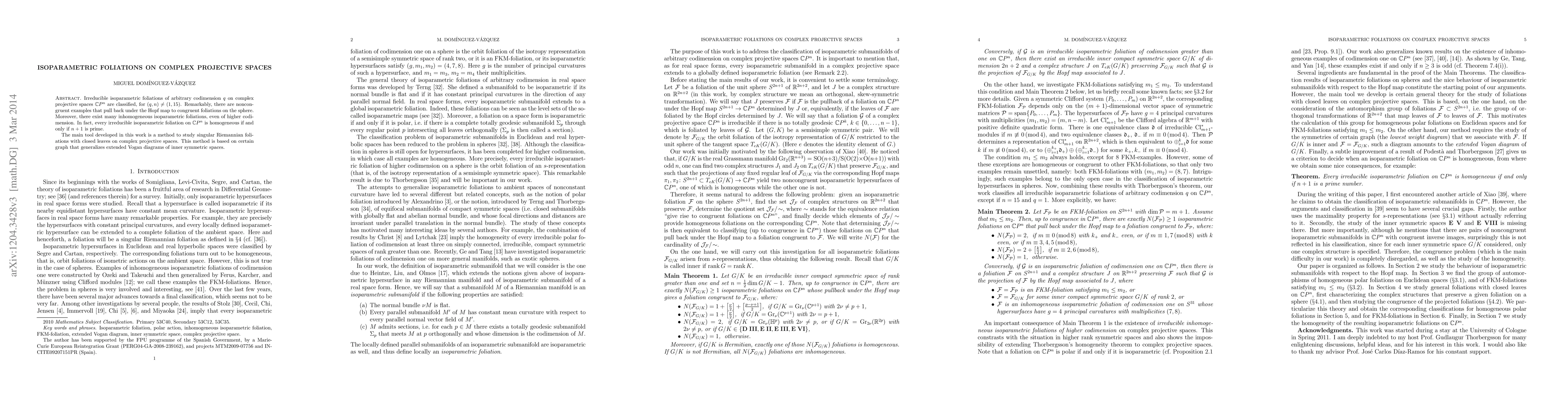 This paper classifies irreducible isoparametric foliations on complex projective spaces, revealing that noncongruent examples exist and can be related via the Hopf map. It introduces a novel method based on generalized Vogan diagrams to study singular Riemannian foliations, proving that homogeneity of such foliations depends on whether n+1 is prime.