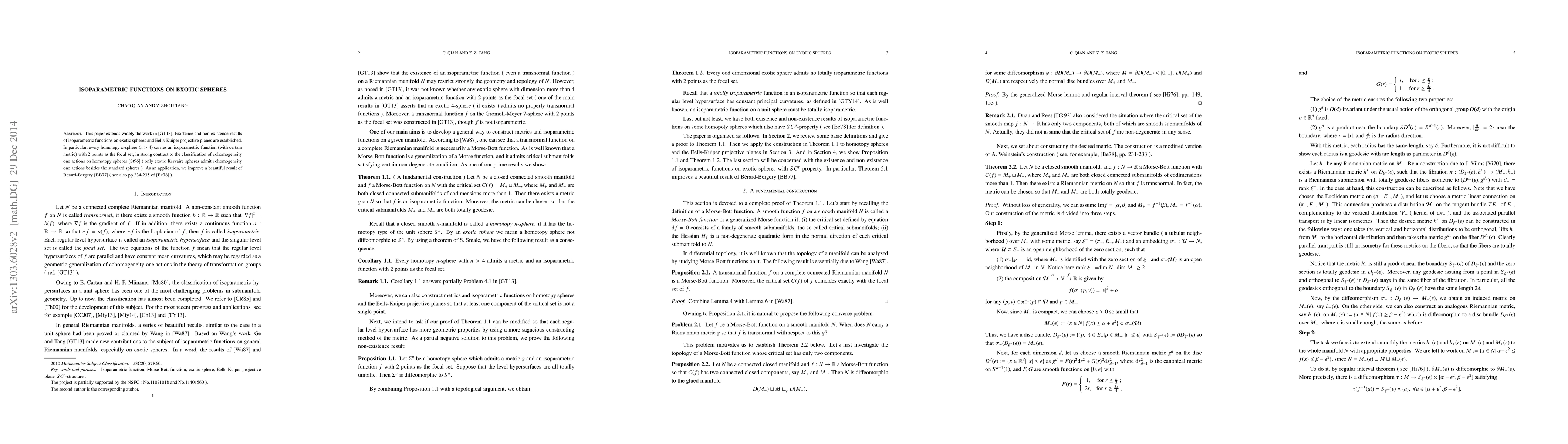 This paper extends widely the work in \cite{GT13}. Existence and non-existence results of isoparametric functions on exotic spheres and Eells-Kuiper projective planes are established. In particular, every homotopy $n$-sphere ($n>4$) carries an isoparametric function (with certain metric) with 2 points as the focal set, in strong contrast to the classification of cohomogeneity one actions on homotopy spheres \cite{St96} ( only exotic Kervaire spheres admit cohomogeneity one actions besides the standard spheres ). As an application, we improve a beautiful result of B\'{e}rard-Bergery \cite{BB77} ( see also pp.234-235 of \cite{Be78} ).