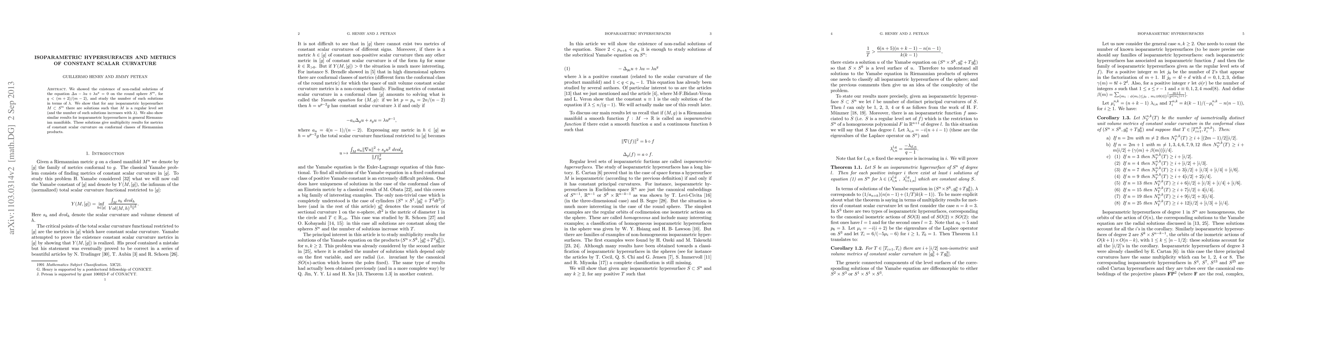 The paper proves the existence of non-radial solutions to a specific equation on the round sphere and isoparametric hypersurfaces, with the number of solutions increasing with a parameter lambda. These findings lead to multiplicity results for metrics of constant scalar curvature on certain Riemannian manifolds.