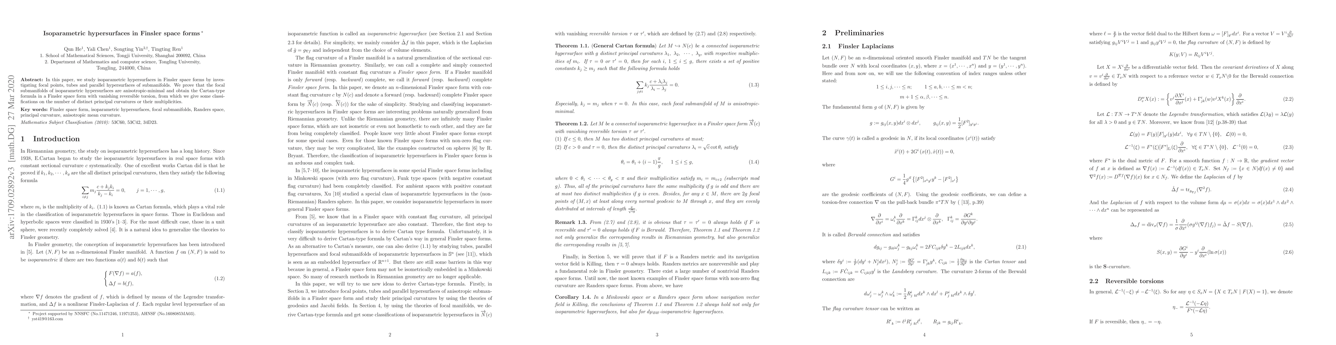 This paper investigates isoparametric hypersurfaces in Finsler space forms, focusing on focal points and parallel hypersurfaces. It proves that focal submanifolds are anisotropic-minimal and derives a Cartan-type formula, leading to classifications of distinct principal curvatures and their multiplicities.