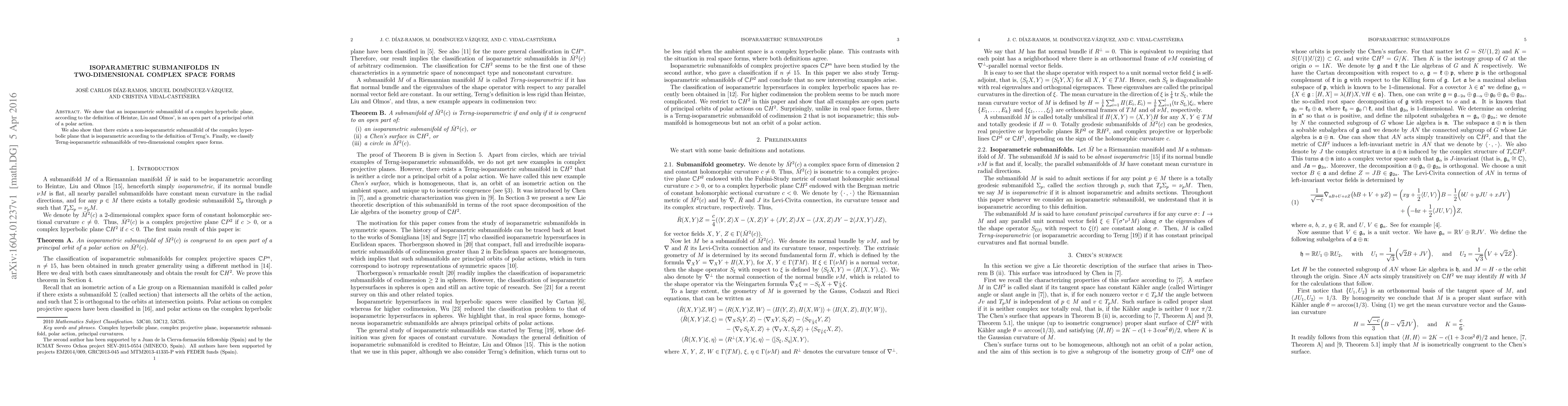 We show that an isoparametric submanifold of a complex hyperbolic plane, according to the definition of Heintze, Liu and Olmos', is an open part of a principal orbit of a polar action. We also show that there exists a non-isoparametric submanifold of the complex hyperbolic plane that is isoparametric according to the definition of Terng's. Finally, we classify Terng-isoparametric submanifolds of two-dimensional complex space forms.