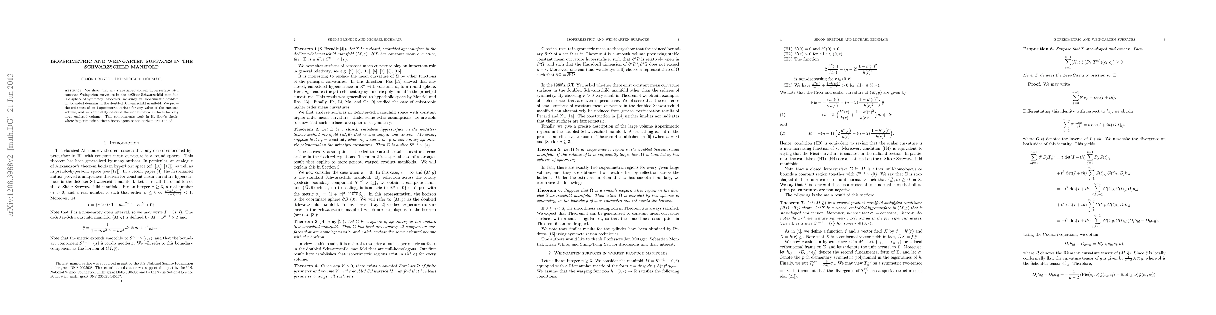 This paper demonstrates that any star-shaped convex hypersurface with constant Weingarten curvature in the deSitter-Schwarzschild manifold is a symmetric sphere. It also proves the existence of isoperimetric surfaces for any volume in the Schwarzschild manifold and fully describes these surfaces for large volumes.