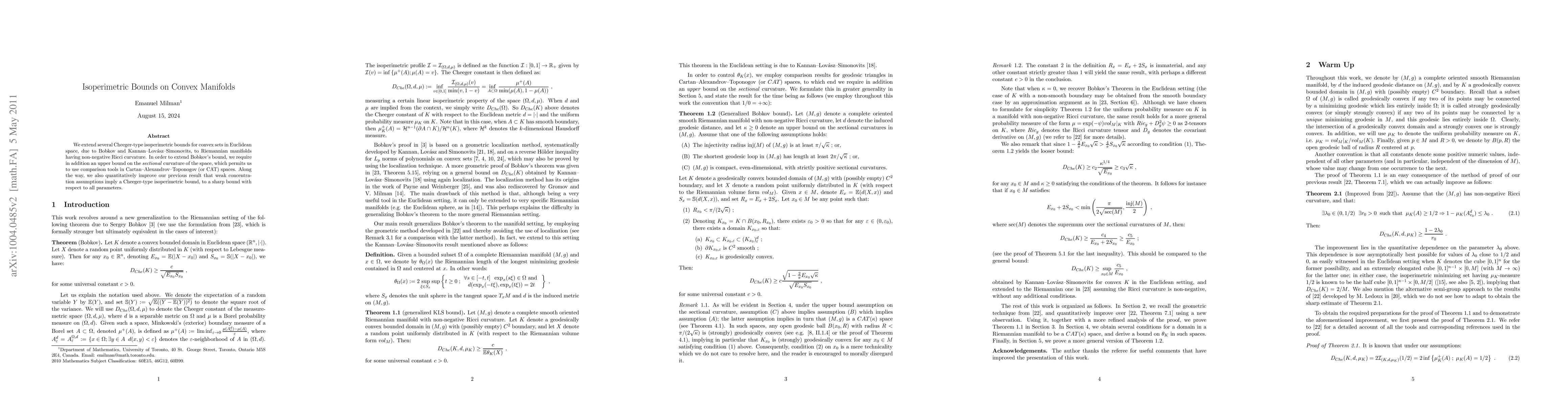 We extend several Cheeger-type isoperimetric bounds for convex sets in Euclidean space, due to Bobkov and Kannan-Lov\'asz-Simonovits, to Riemannian manifolds having non-negative Ricci curvature. In order to extend Bobkov's bound, we require in addition an upper bound on the sectional curvature of the space, which permits us to use comparison tools in Cartan-Alexandrov-Toponogov (or CAT) spaces. Along the way, we also quantitatively improve our previous result that weak concentration assumptions imply a Cheeger-type isoperimetric bound, to a sharp bound with respect to all parameters.