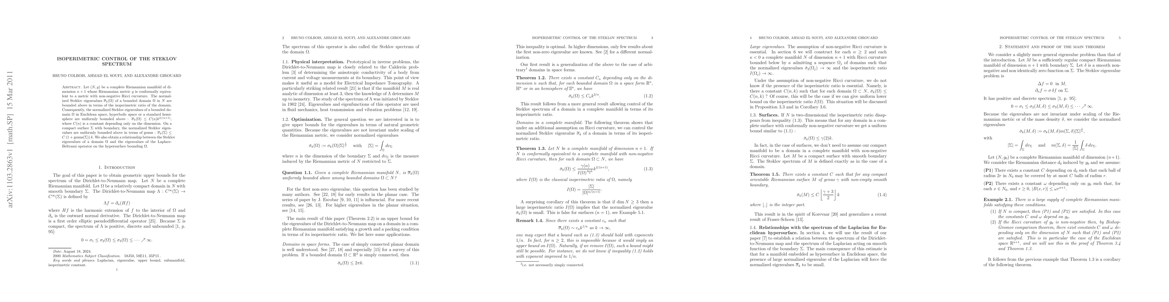 This paper establishes an upper bound for the normalized Steklov eigenvalues of a bounded domain in a Riemannian manifold with non-negative Ricci curvature, using the domain's isoperimetric ratio. It also shows uniform bounds for Euclidean, hyperbolic, and hemispherical spaces, and relates Steklov eigenvalues to those of the Laplace-Beltrami operator on the boundary.