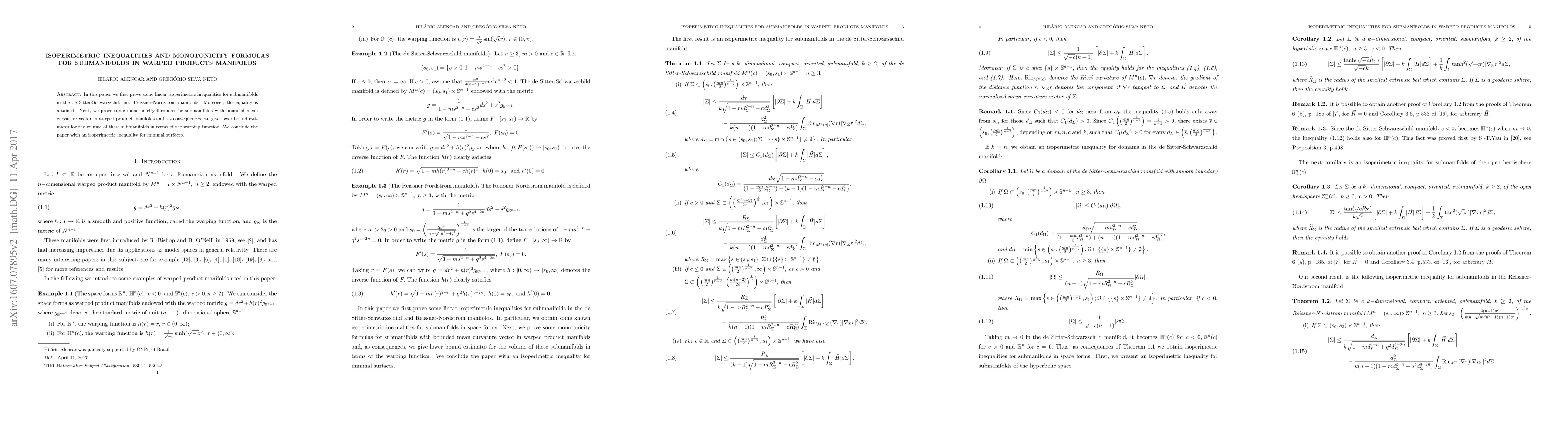 This paper proves linear isoperimetric inequalities for submanifolds in de Sitter-Schwarzschild and Reissner-Nordstrom manifolds, showing equality attainment. It also establishes monotonicity formulas for submanifolds with bounded mean curvature in warped product manifolds, providing volume lower bounds in terms of the warping function, and concludes with an isoperimetric inequality for minimal surfaces.