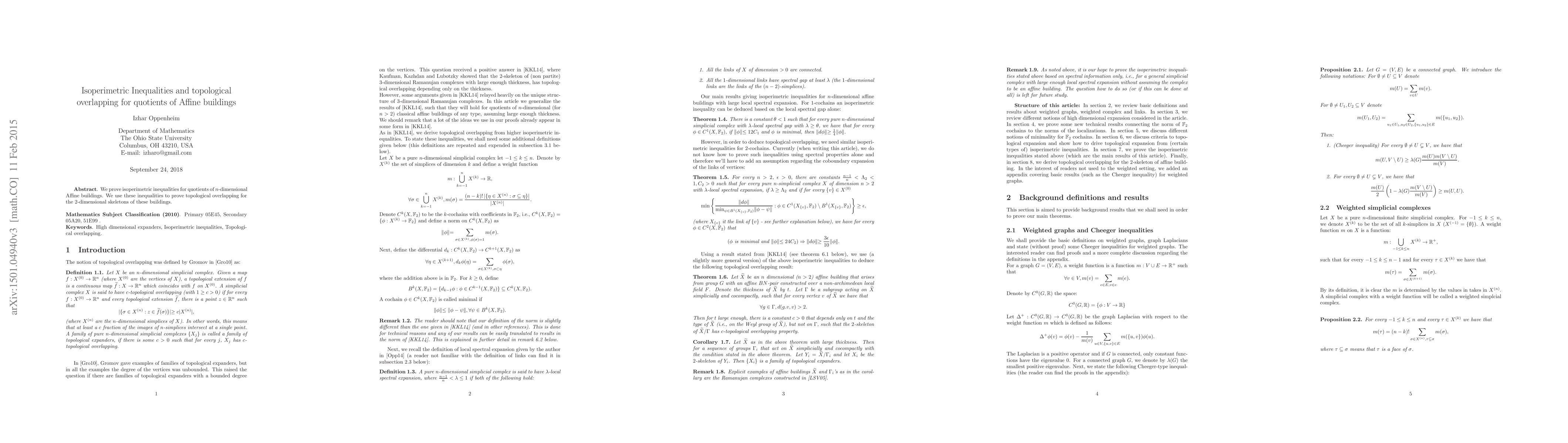 This paper proves isoperimetric inequalities for quotients of $n$-dimensional affine buildings and utilizes these inequalities to establish topological overlapping for the 2-dimensional skeletons of these buildings.