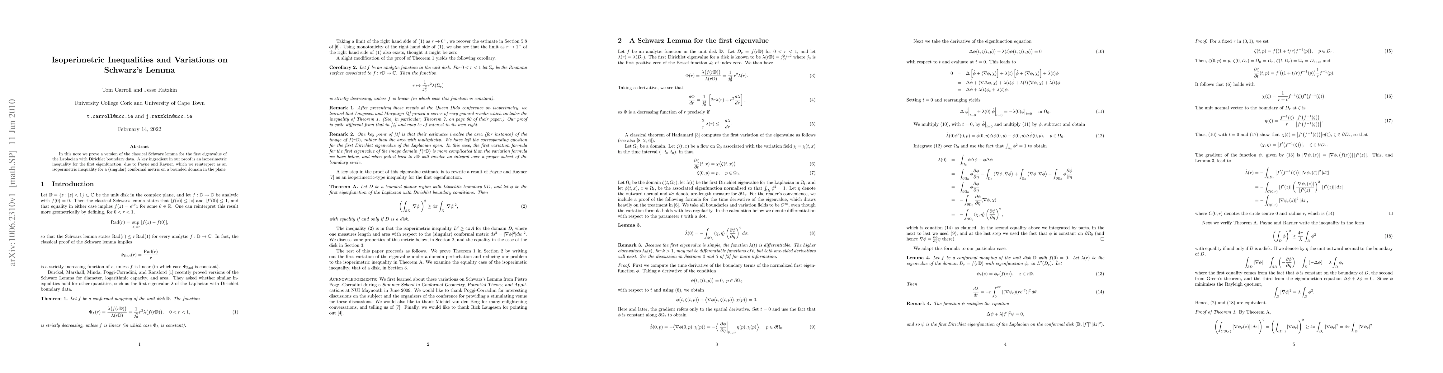 In this note we prove a version of the classical Schwarz lemma for the first eigenvalues of the Laplacian with Dirichlet boundary data. A key ingredient in our proof is an isoperimetric inequality for the first eigenfunction, due to Payne and Rayner, which we reinterpret as an isoperimetric inequality for a (singular) conformal metric on a bounded domain in the plane.