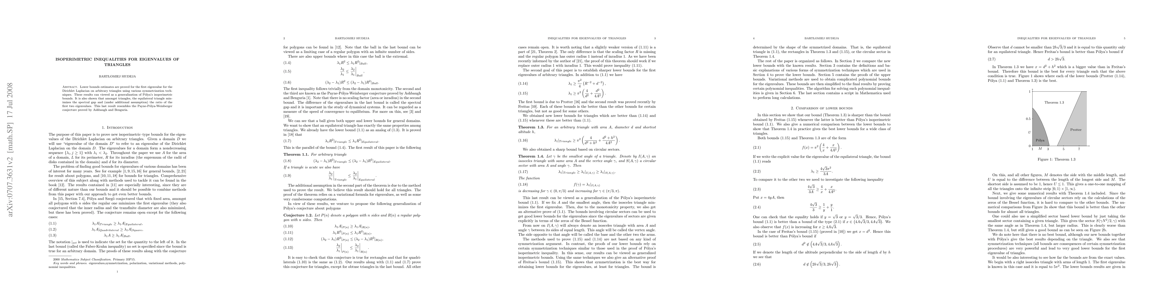 Lower bounds estimates are proved for the first eigenvalue for the Dirichlet Laplacian on arbitrary triangles using various symmetrization techniques. These results can viewed as a generalization of P\'olya's isoperimetric bounds. It is also shown that amongst triangles, the equilateral triangle minimizes the spectral gap and (under additional assumption) the ratio of the first two eigenvalues. This last result resembles the Payne-P\'olya-Weinberger conjecture proved by Ashbaugh and Benguria.
