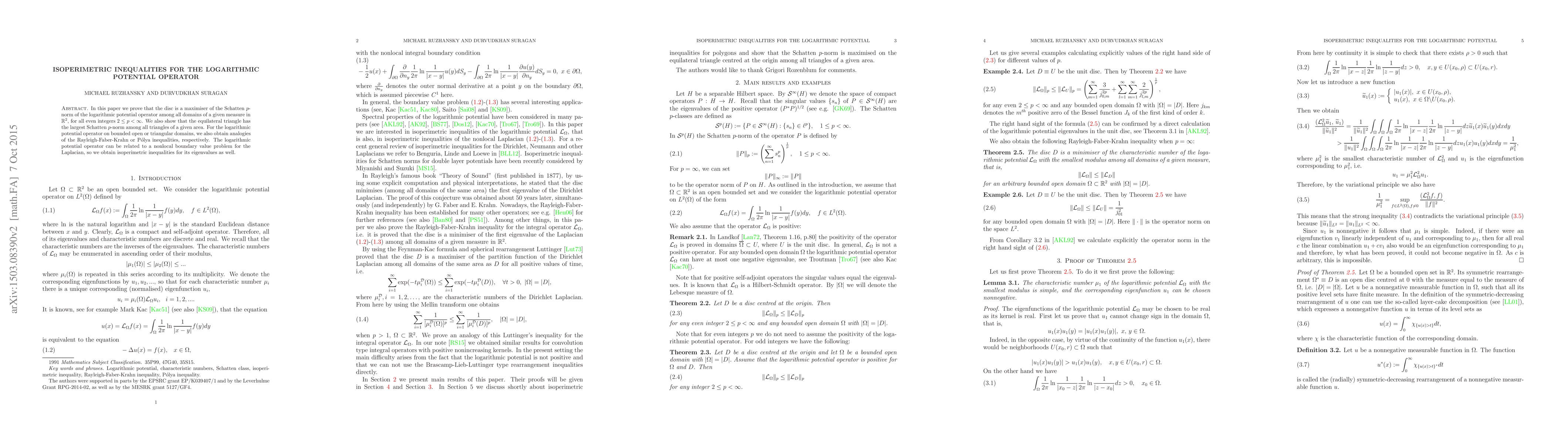 In this paper we prove that the disc is a maximiser of the Schatten $p$-norm of the logarithmic potential operator among all domains of a given measure in $\mathbb R^{2}$, for all even integers $2\leq p<\infty$. We also show that the equilateral triangle has the largest Schatten $p$-norm among all triangles of a given area. For the logarithmic potential operator on bounded open or triangular domains, we also obtain analogies of the Rayleigh-Faber-Krahn or P{\'o}lya inequalities, respectively. The logarithmic potential operator can be related to a nonlocal boundary value problem for the Laplacian, so we obtain isoperimetric inequalities for its eigenvalues as well.