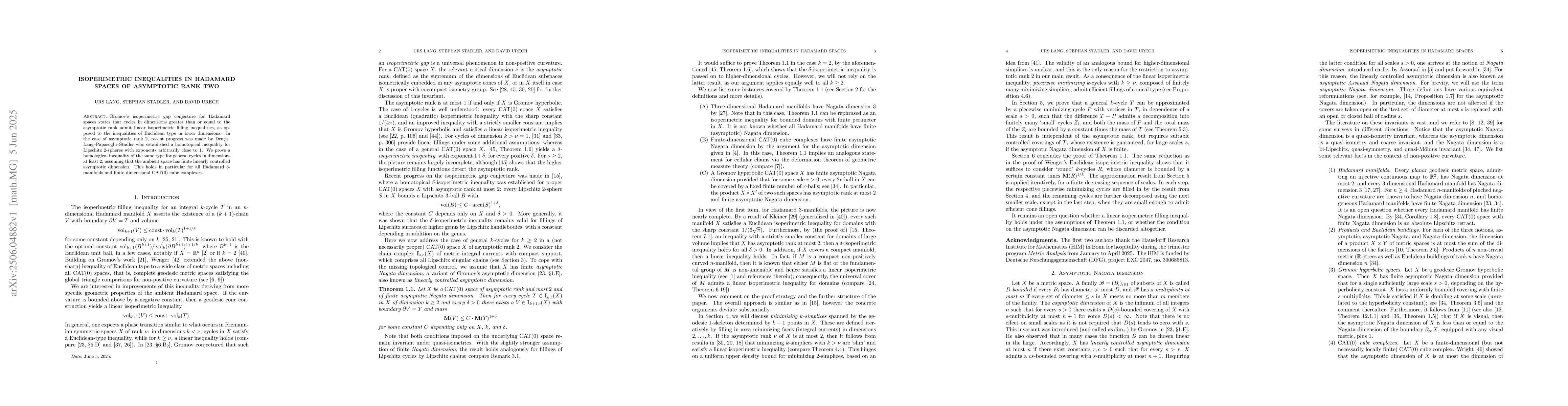 The paper presents a homological isoperimetric inequality for general cycles in dimensions at least 2 in Hadamard spaces of asymptotic rank 2, which is a significant advancement in the field.