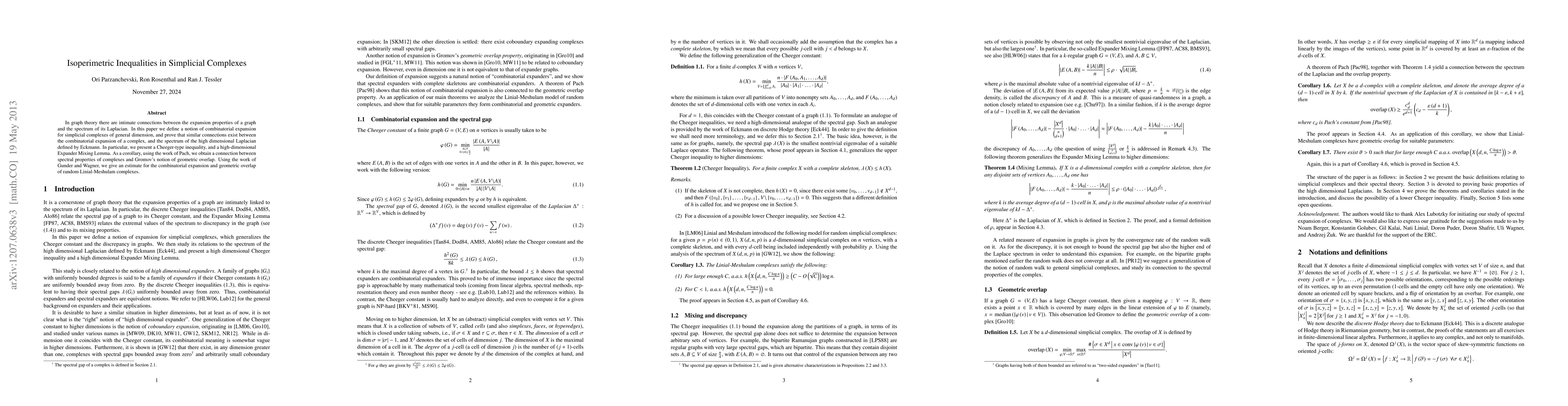 This paper establishes a connection between combinatorial expansion in simplicial complexes and the spectrum of their high-dimensional Laplacian, presenting a Cheeger-type inequality and an Expander Mixing Lemma. It also links spectral properties to geometric overlap and estimates expansion for random Linial-Meshulam complexes.