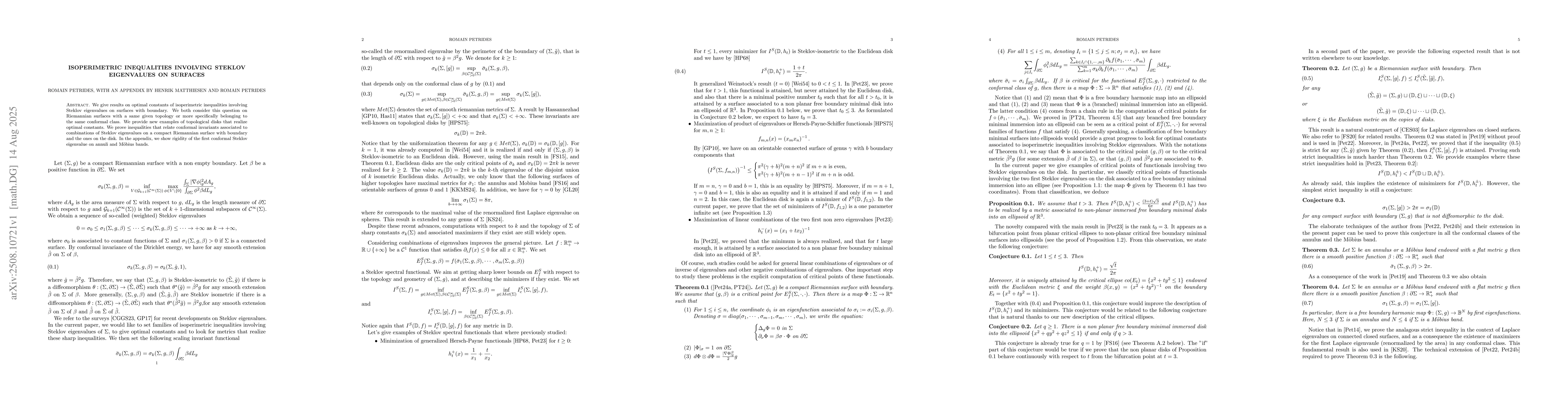 We give results on optimal constants of isoperimetric inequalities involving Steklov eigenvalues on surfaces with boundary. We both consider this question on Riemannian surfaces with a same given topology or more specifically belonging to the same conformal class. We provide new examples of topological disks that realize optimal constants. We prove inequalities that relate conformal invariants associated to combinations of Steklov eigenvalues on a compact Riemannian surface with boundary and the ones on the disk. In the appendix, we show rigidity of the first conformal Steklov eigenvalue on annuli and M\"obius bands.