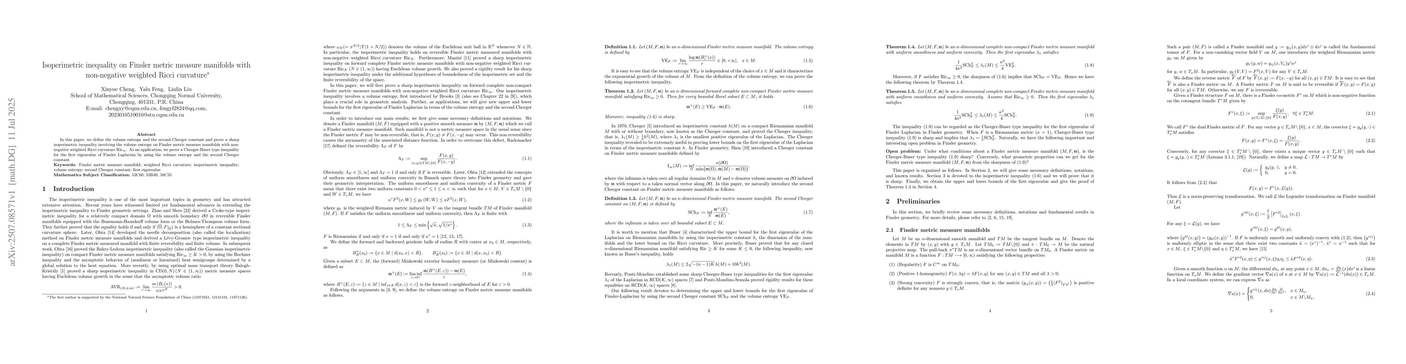 In this paper, we define the volume entropy and the second Cheeger constant and prove a sharp isoperimetric inequality involving the volume entropy on Finsler metric measure manifolds with non-negative weighted Ricci curvature ${\rm Ric}_{\infty}$. As an application, we prove a Cheeger-Buser type inequality for the first eigenvalue of Finsler Laplacian by using the volume entropy and the second Cheeger constant.