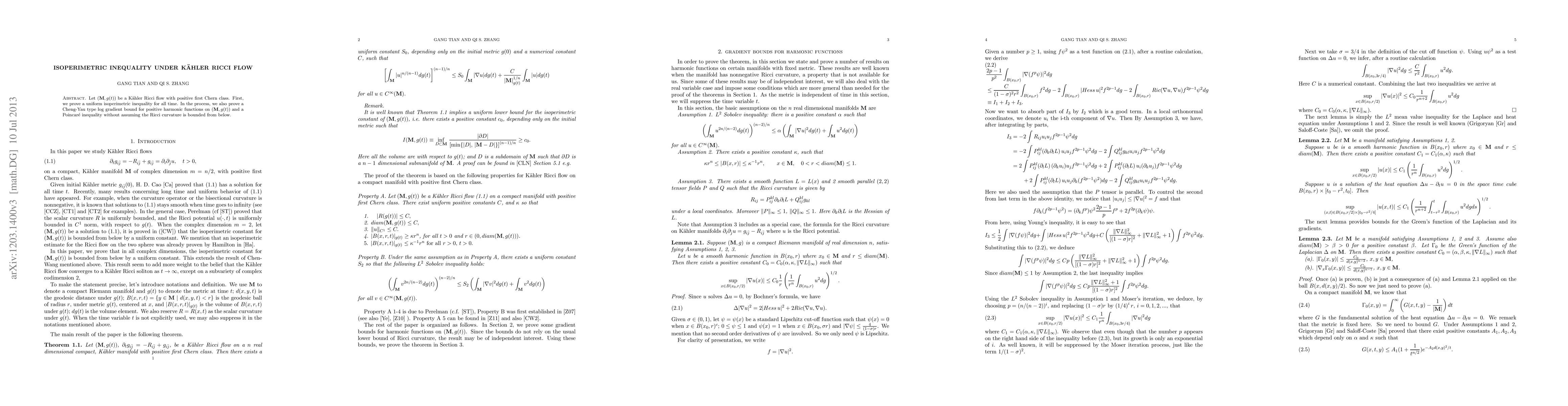 This paper proves a uniform isoperimetric inequality for Kähler Ricci flows with positive first Chern class, alongside a Cheng-Yau type log gradient bound for harmonic functions and a Poincaré inequality without lower Ricci curvature bounds.