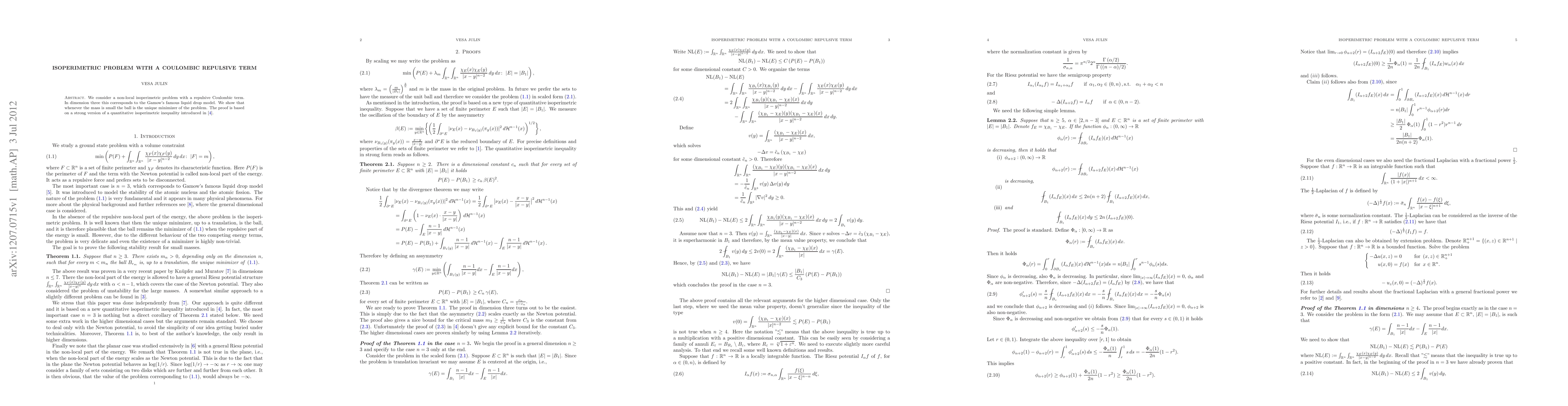 This paper investigates a non-local isoperimetric problem incorporating a Coulombic repulsive term, analogous to Gamow's liquid drop model in three dimensions. It demonstrates that for small masses, the ball is the unique minimizer, relying on a strong quantitative isoperimetric inequality.