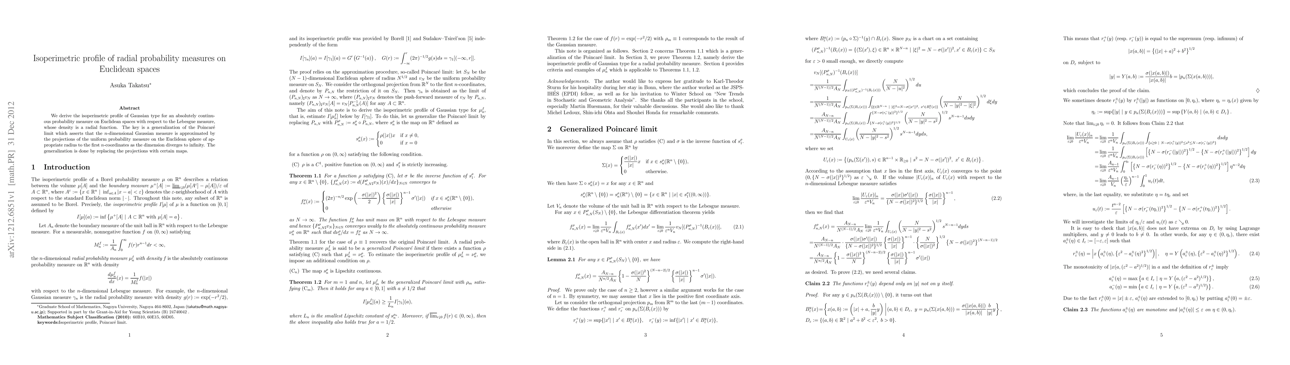 We derive the isoperimetric profile of Gaussian type for an absolutely continuous probability measure on Euclidean spaces with respect to the Lebesgue measure, whose density is a radial function.The key is a generalization of the Poincar\'e limit which asserts that the $n$-dimensional Gaussian measure is approximated by the projections of the uniform probability measure on the Euclidean sphere of appropriate radius to the first $n$-coordinates as the dimension diverges to infinity. The generalization is done by replacing the projections with certain maps.