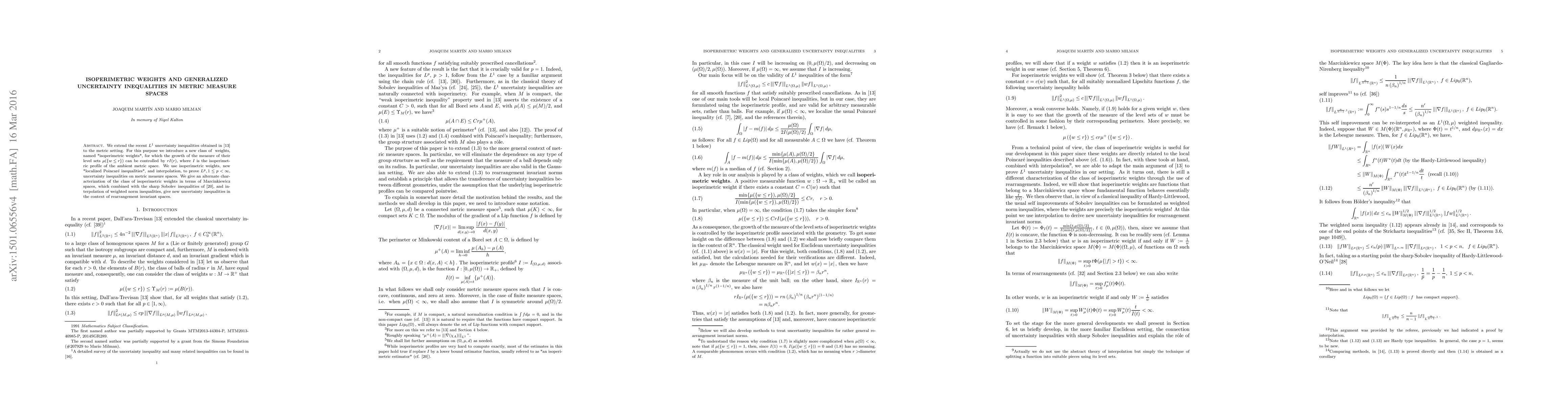 This paper extends $L^{1}$ uncertainty inequalities to metric measure spaces using a new class of isoperimetric weights. It proves $L^{p}$ uncertainty inequalities via localized Poincaré inequalities and interpolation, and provides an alternate characterization of these weights in terms of Marcinkiewicz spaces.