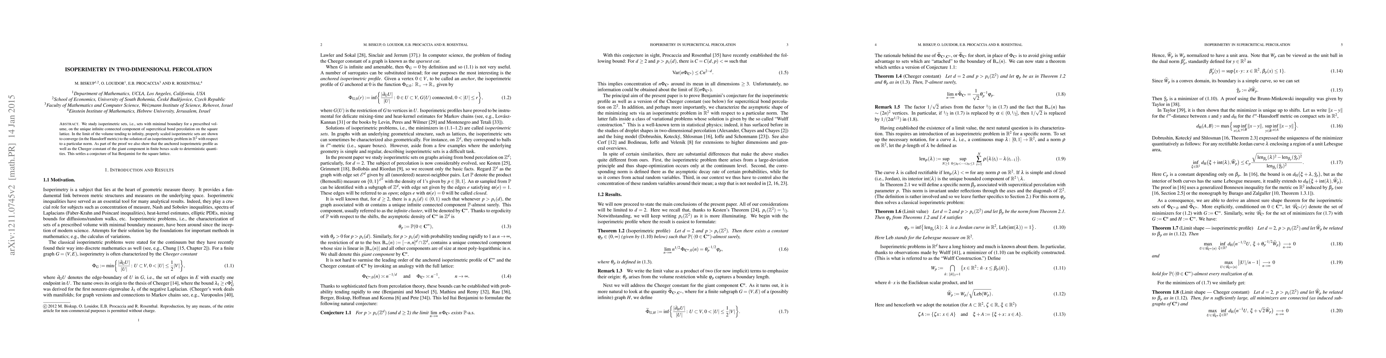 This paper investigates the geometric properties of isoperimetric sets in supercritical bond percolation on the square lattice, proving that their asymptotic shapes match those derived from an isoperimetric problem in the plane. It also demonstrates that the anchored isoperimetric profile and Cheeger constant scale to deterministic values, thus confirming a conjecture by Itai Benjamini.