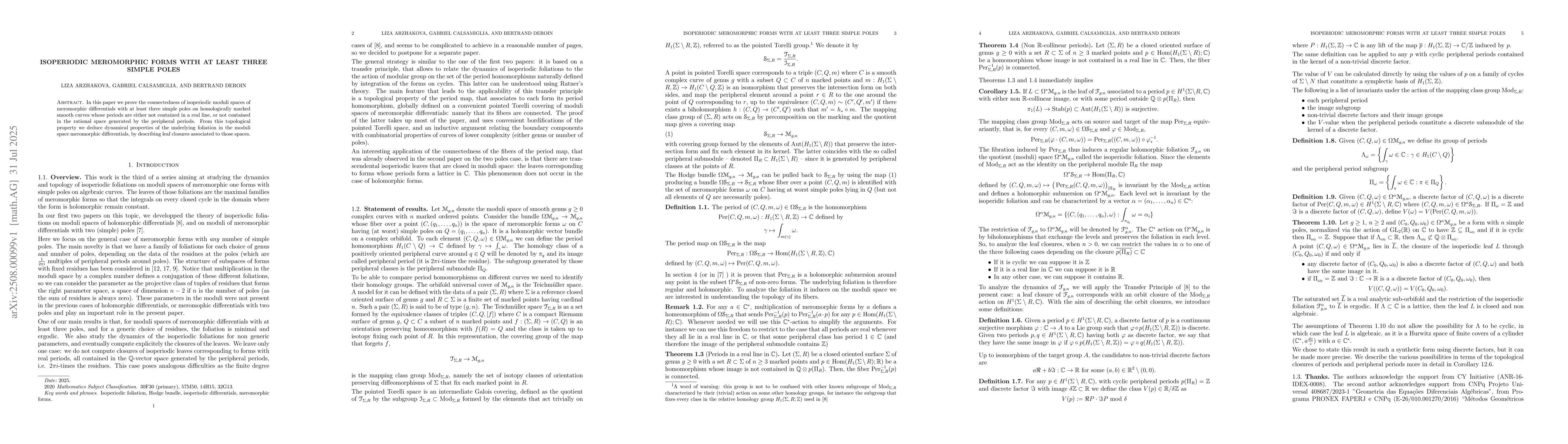 The paper employs a combination of complex analysis, differential geometry, and algebraic topology to study isoperiodic moduli spaces of meromorphic differentials with at least three simple poles on smooth curves.