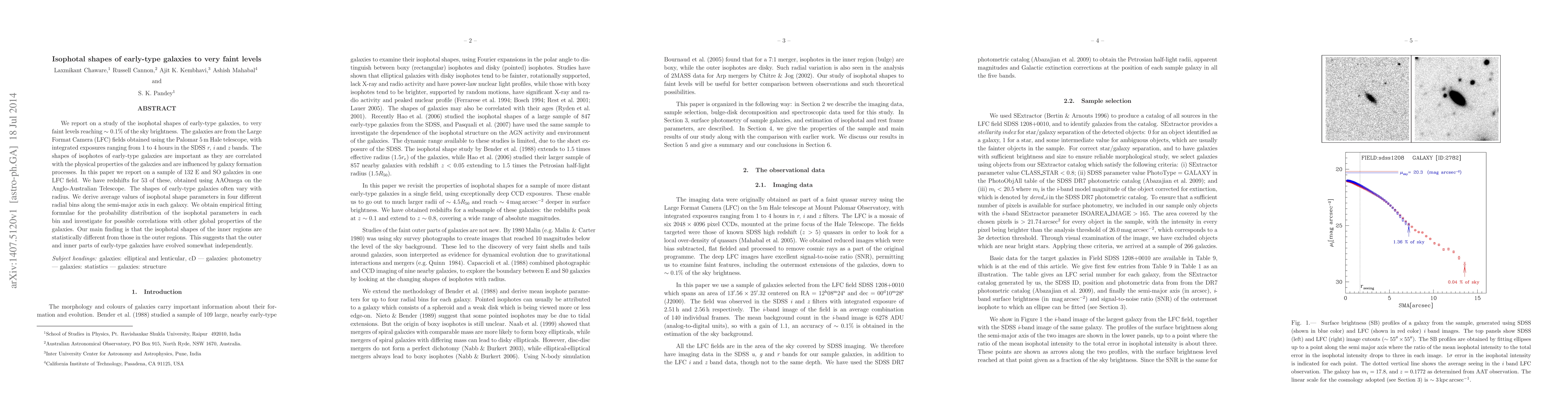 We report on a study of the isophotal shapes of early-type galaxies, to very faint levels reaching ~ 0.1% of the sky brightness. The galaxies are from the Large Format Camera (LFC) fields obtained using the Palomar 5 m Hale telescope, with integrated exposures ranging from 1 to 4 hours in the SDSS r, i and z bands. The shapes of isophotes of early-type galaxies are important as they are correlated with the physical properties of the galaxies and are influenced by galaxy formation processes. In this paper we report on a sample of 132 E and SO galaxies in one LFC field. We have redshifts for 53 of these, obtained using AAOmega on the Anglo-Australian Telescope. The shapes of early-type galaxies often vary with radius. We derive average values of isophotal shape parameters in four different radial bins along the semi-major axis in each galaxy. We obtain empirical fitting formulae for the probability distribution of the sophotal parameters in each bin and investigate for possible correlations with other global properties of the galaxies. Our main finding is that the isophotal shapes of the inner regions are statistically different from those in the outer regions. This suggests that the outer and inner parts of early-type galaxies have evolved somewhat independently.