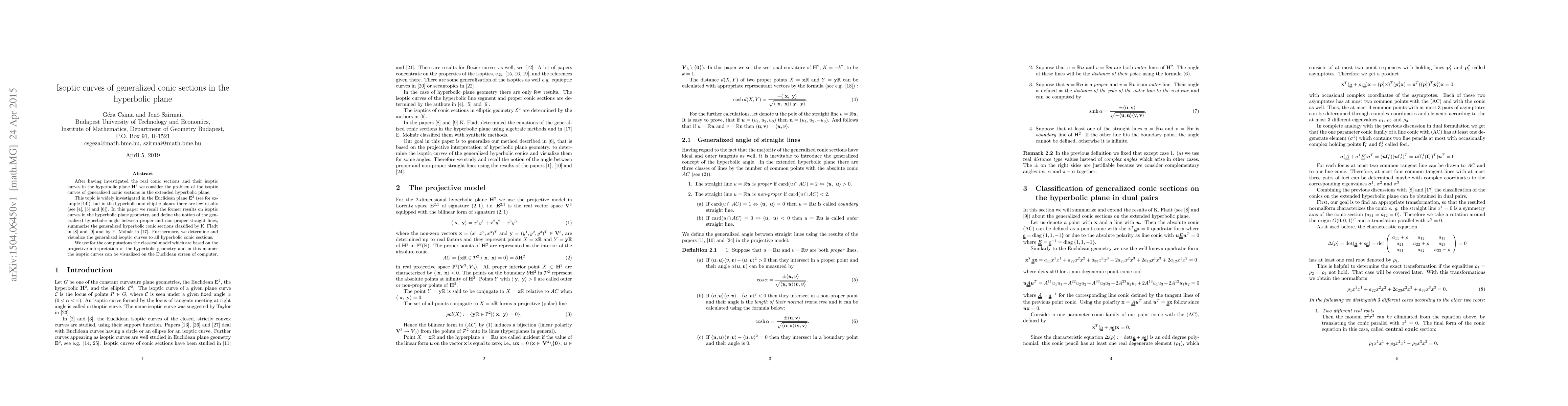 After having investigated the real conic sections and their isoptic curves in the hyperbolic plane $\bH^2$ we consider the problem of the isoptic curves of generalized conic sections in the extended hyperbolic plane. This topic is widely investigated in the Euclidean plane $\BE^2$ (see for example \cite{Lo}), but in the hyperbolic and elliptic planes there are few results (see \cite{CsSz1}, \cite{CsSz2} and \cite{CsSz3}). In this paper we recall the former results on isoptic curves in the hyperbolic plane geometry, and define the notion of the generalised hyperbolic angle between proper and non-proper straight lines, summarize the notions of generalized hyperbolic conic sections classified by K.~Fladt in \cite{KF1} and \cite{KF2} and gy E.~Moln\'ar in \cite{M81}. Furthermore, we determine and visualize the generalized isoptic curves to all hyperbolic conic sections. We use for the computations the classical models which are based on the projective interpretation of the hyperbolic geometry and in this manner the isoptic curves can be visualized on the Euclidean screen of computer.
