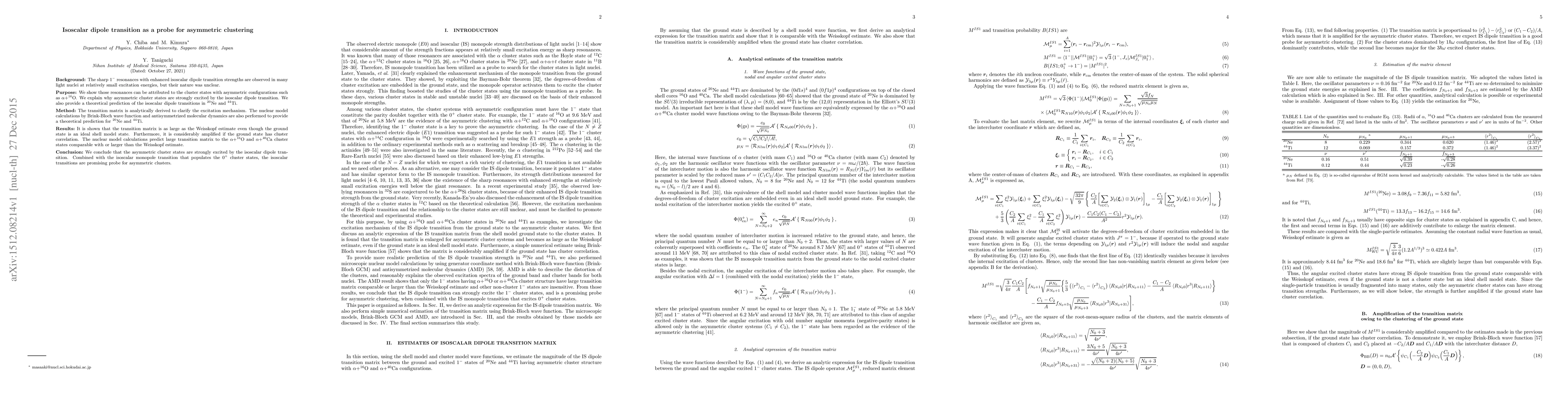 This paper investigates the nature of sharp $1^-$ resonances in light nuclei, attributing them to asymmetric cluster states like $\alpha$+$^{16}{\rm O}$. It demonstrates that these states are strongly excited by isoscalar dipole transitions, providing theoretical predictions for $^{20}{\rm Ne}$ and $^{44}{\rm Ti}$ and concluding that isoscalar transitions are effective probes for asymmetric clustering.